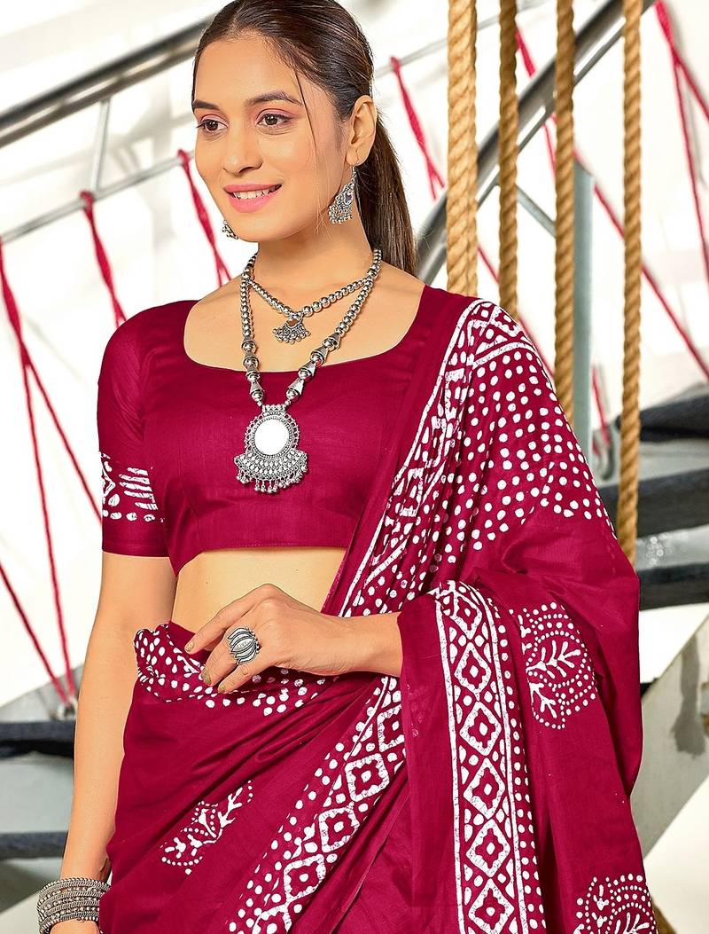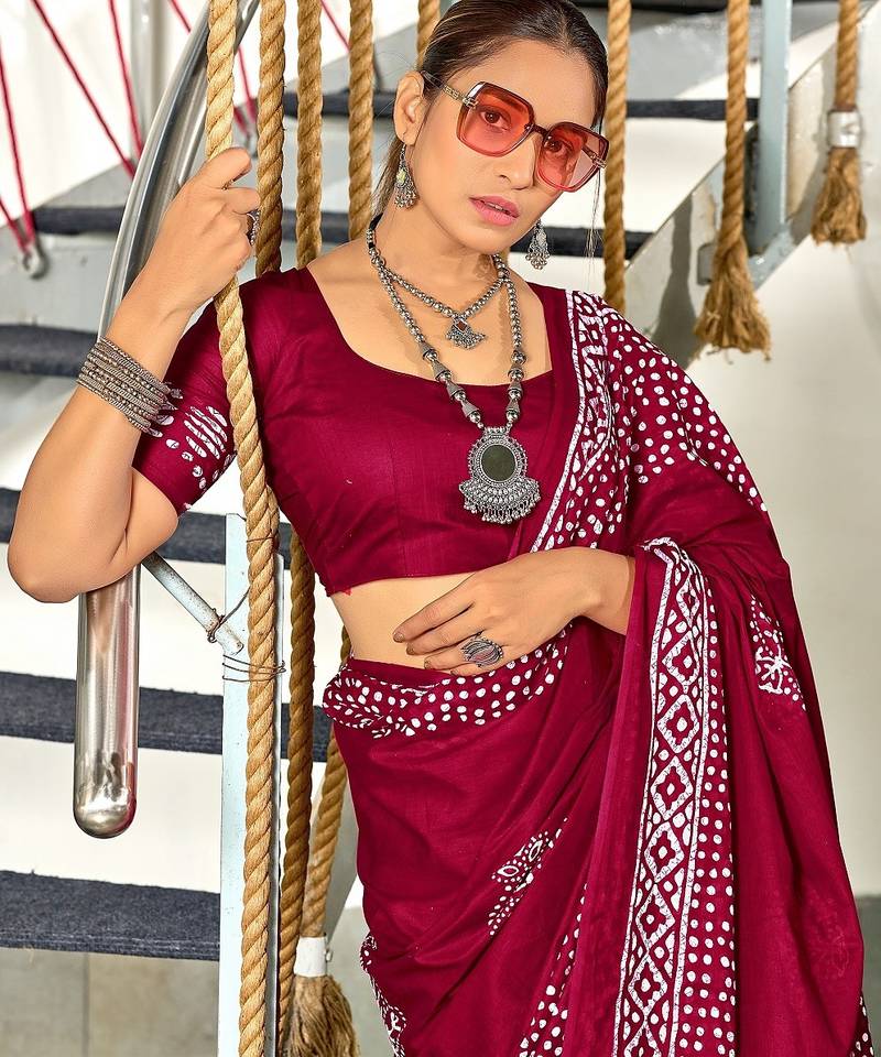 | Product Name | Wine Batik Print Mulmul Cotton Saree With Blouse. | |