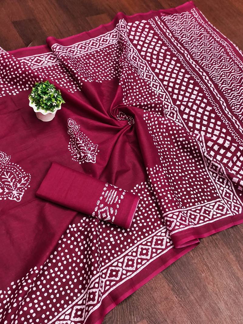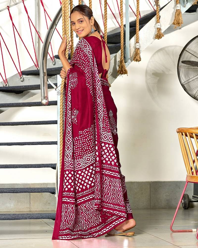 Wine batik print mulmul cotton saree with blouse.