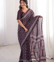 Wine blocked printed, floral print soft pure cotton saree with blouse.