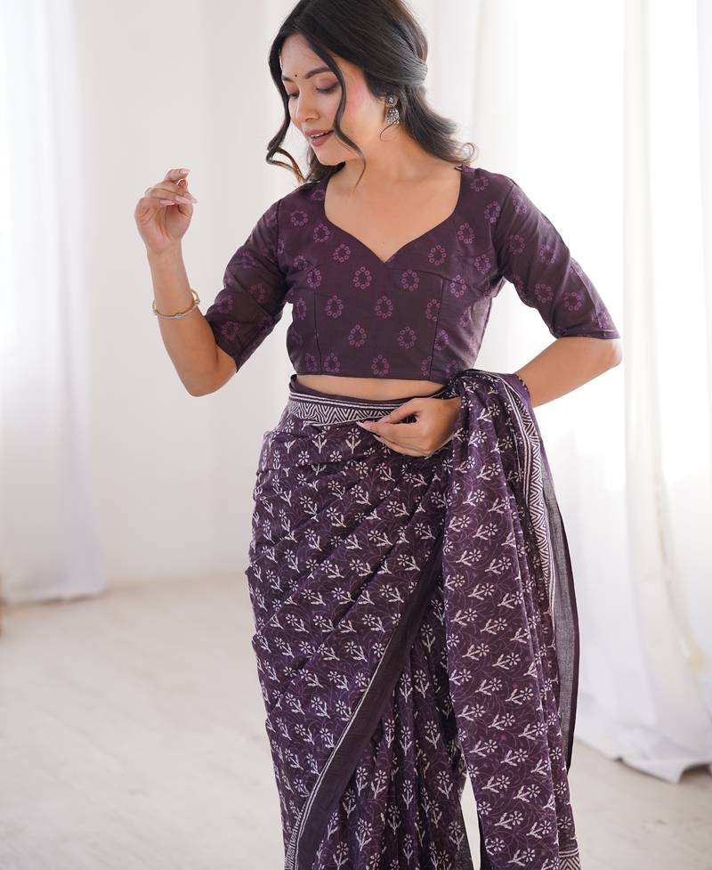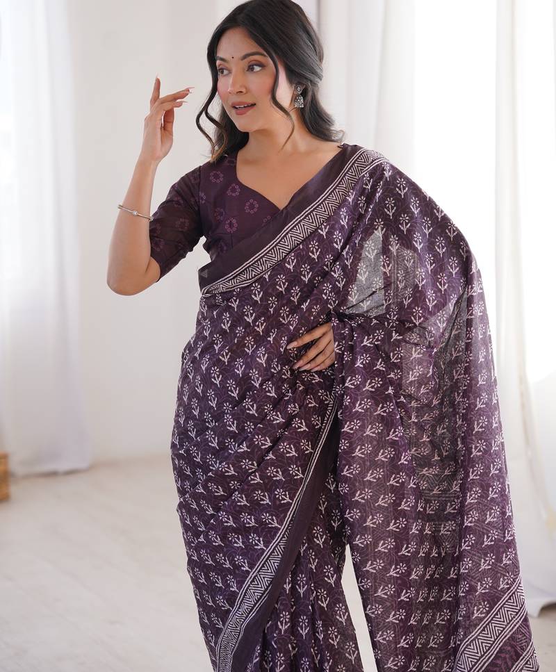 | Product Name | Wine Blocked Printed, Floral Print Soft Pure Cotton Saree With Blouse. | |