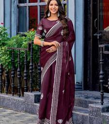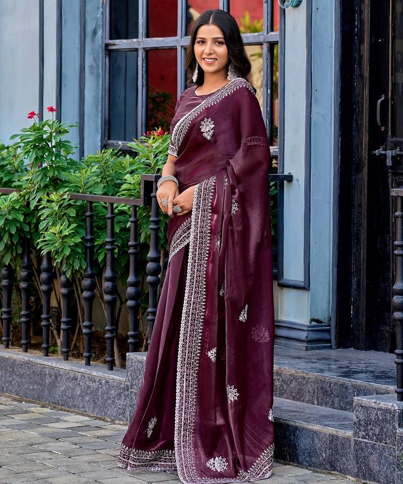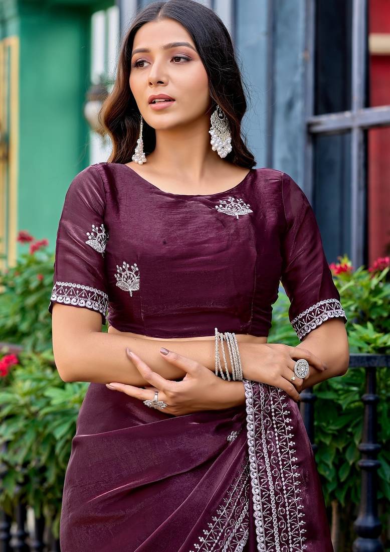 Wine embroidered embellished shimmer chiffon bollywood saree with blouse
