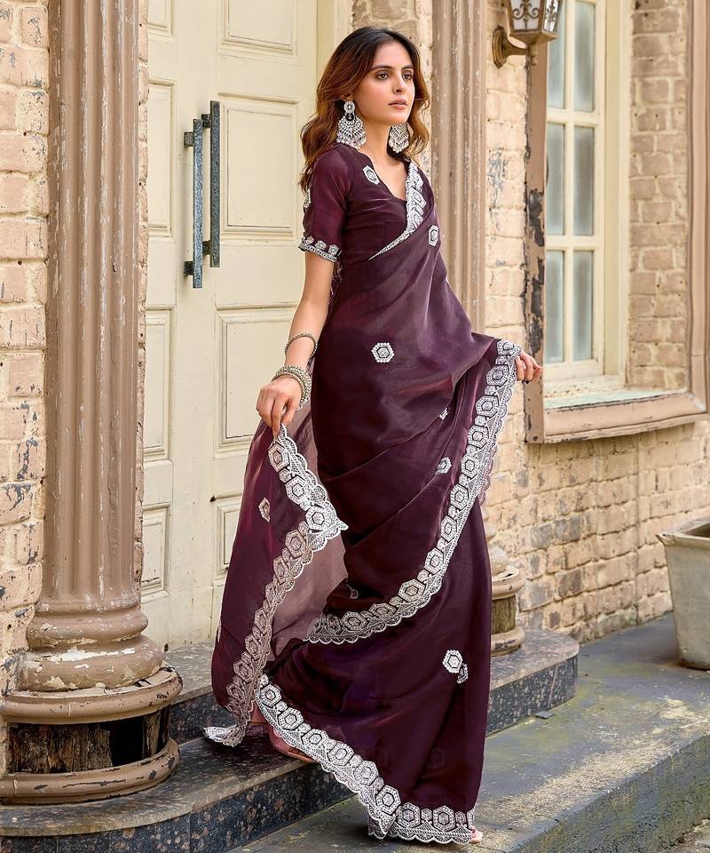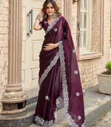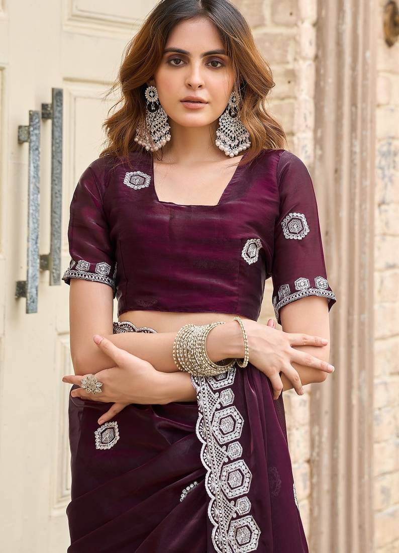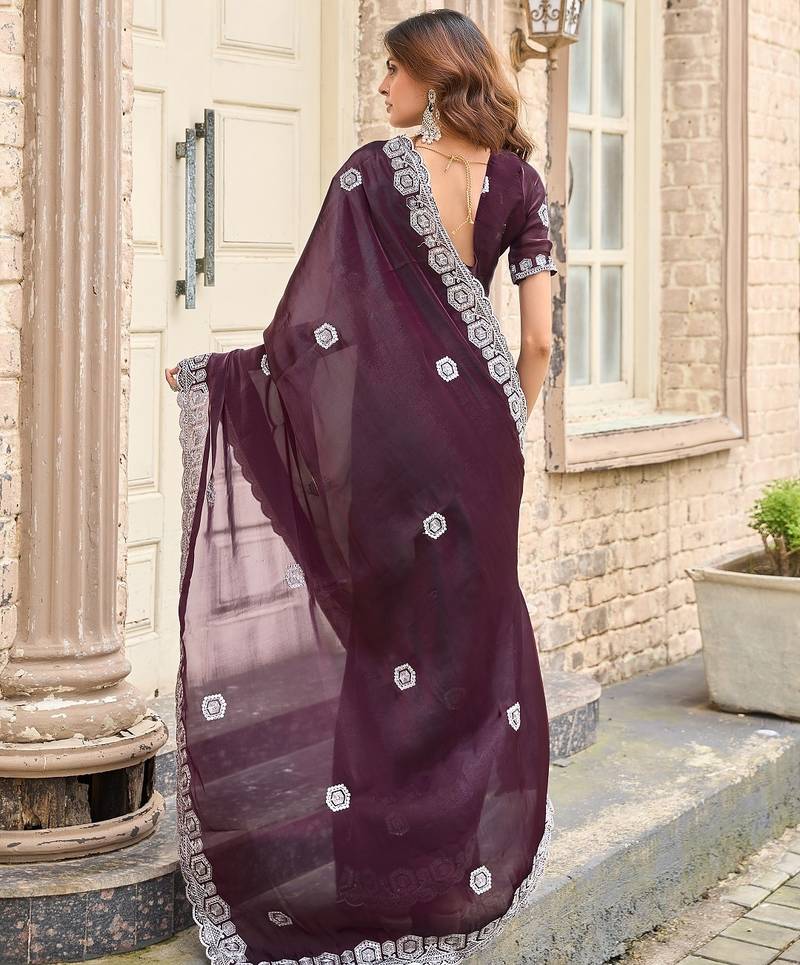 Wine embroidered embellished shimmer chiffon bollywood saree with blouse