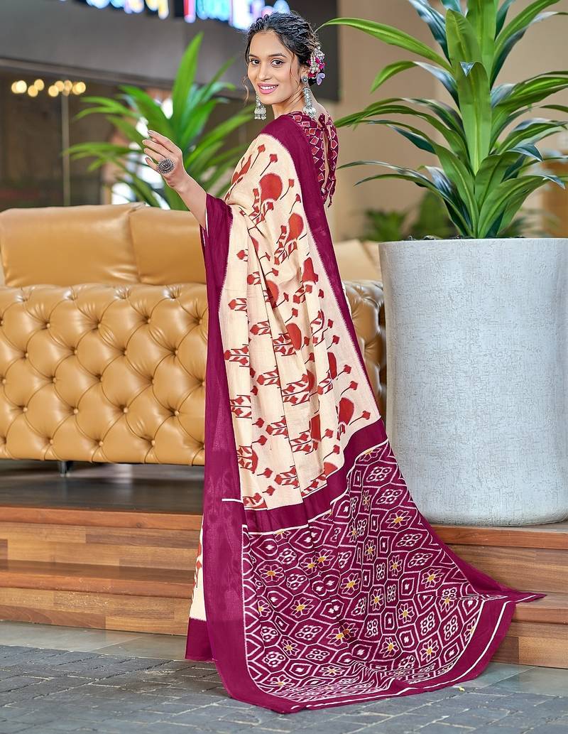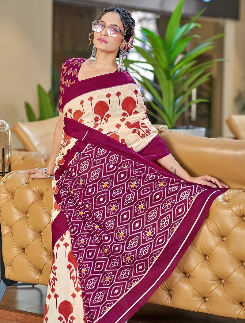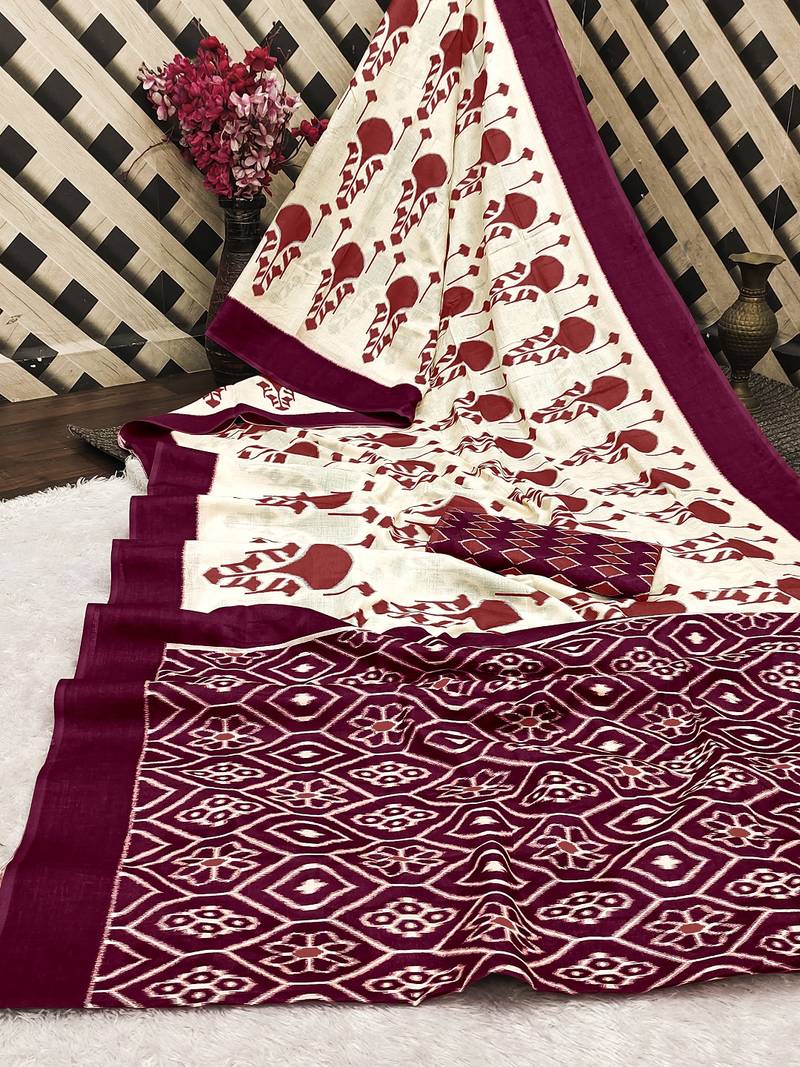 | Product Name | Wine Ikkat, Block Print Soft Pure Cotton Saree With Blouse. | |