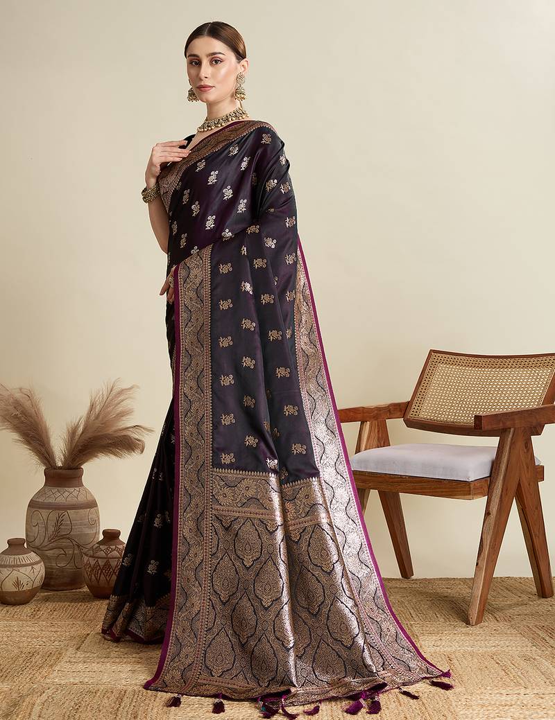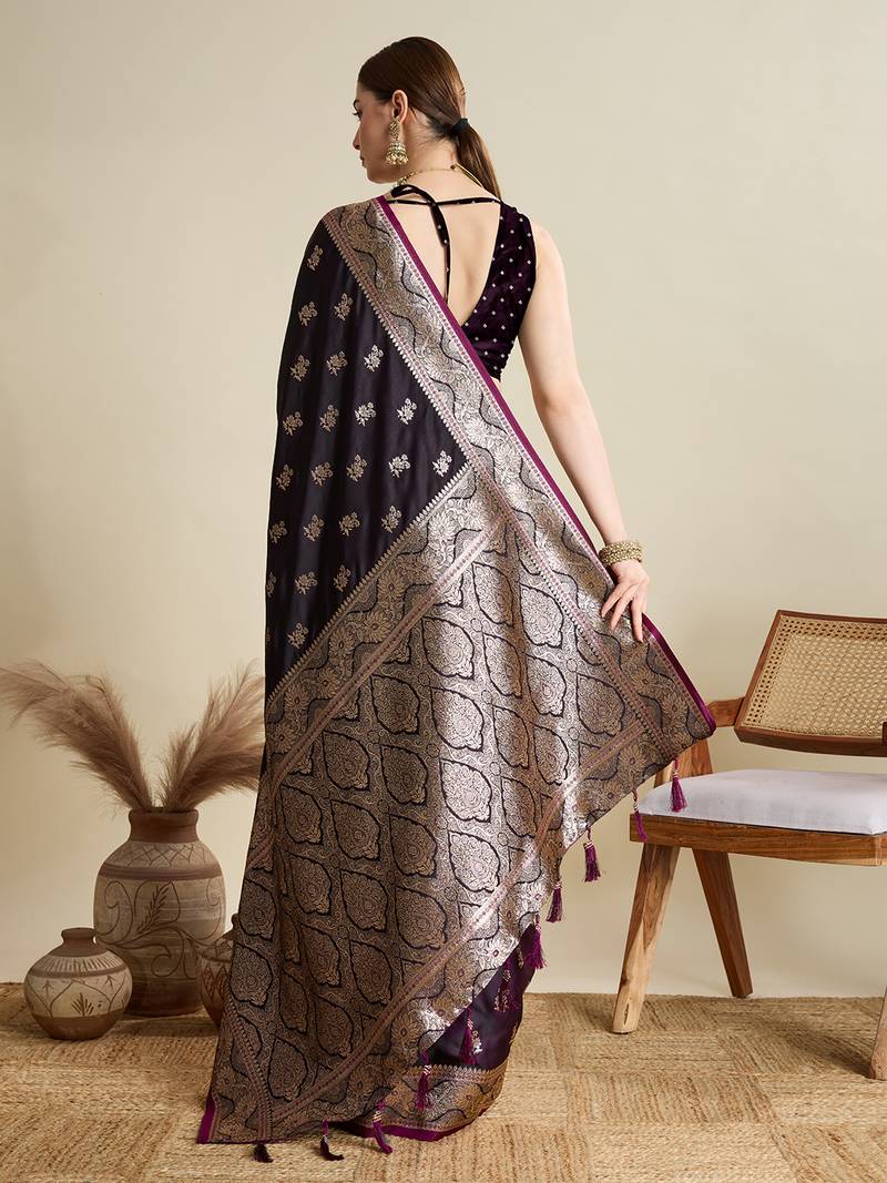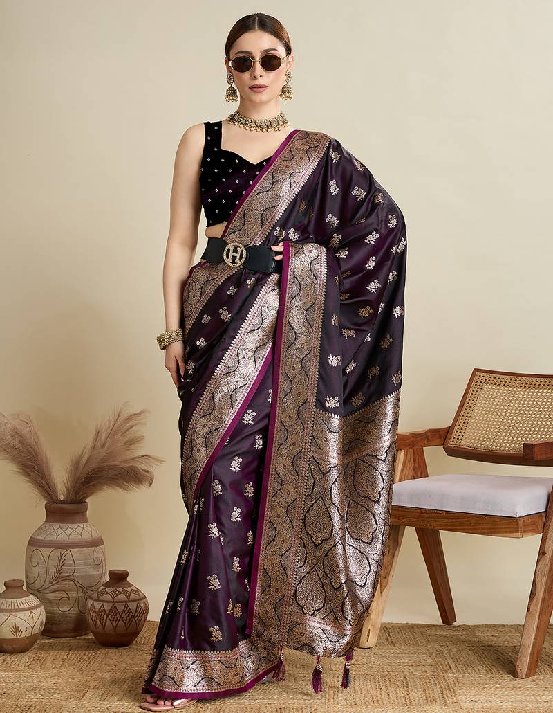 Wine woven embellished self design satin silk blend banarasi saree with blouse