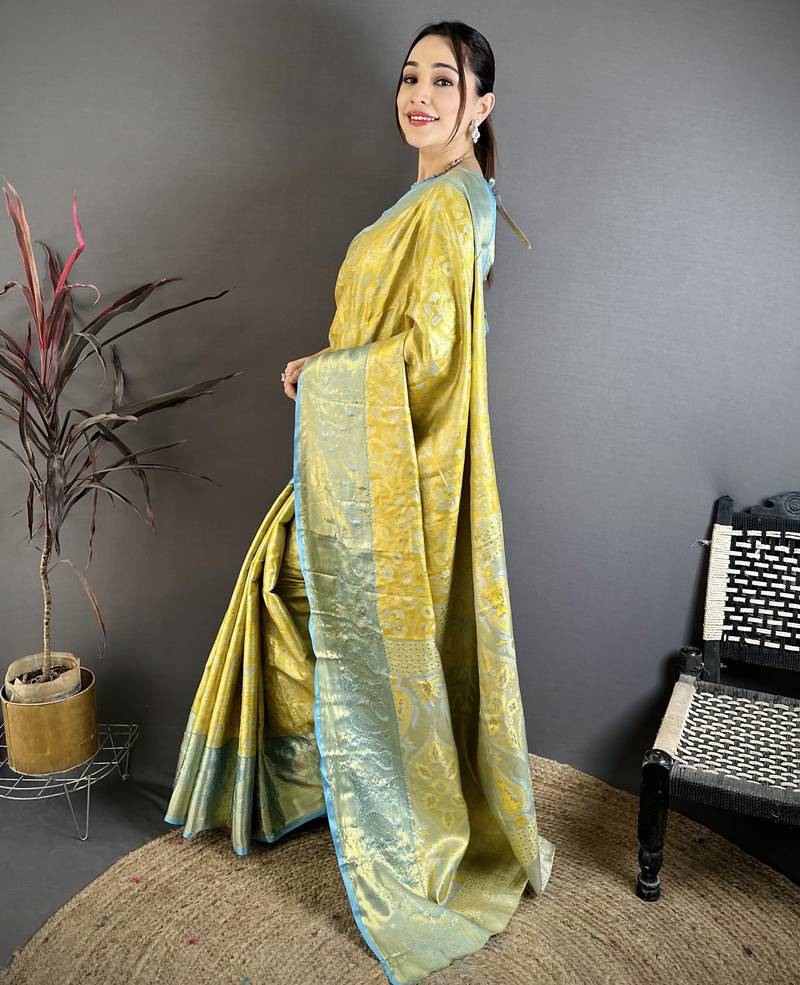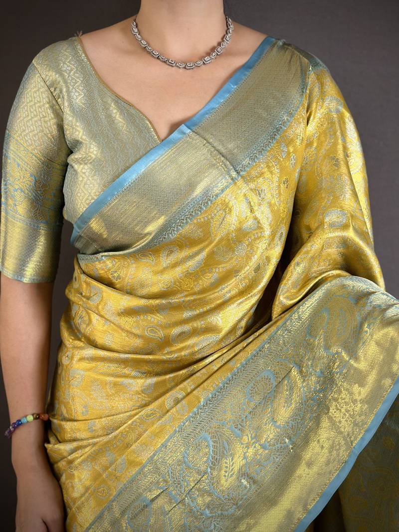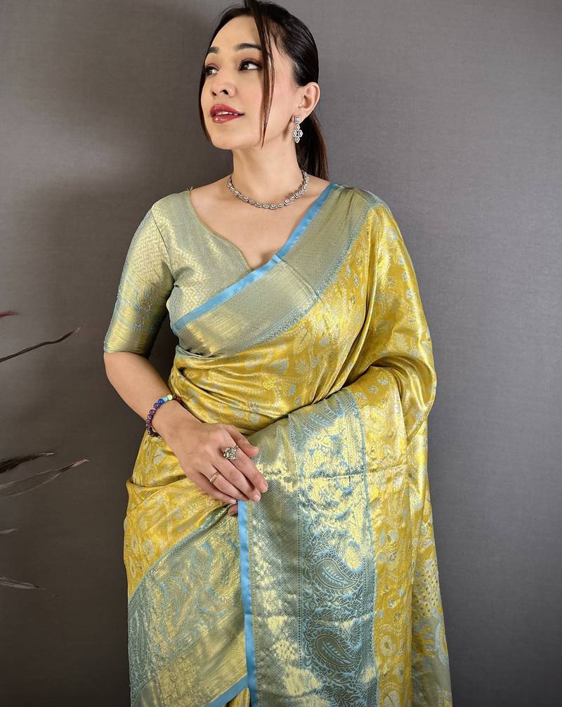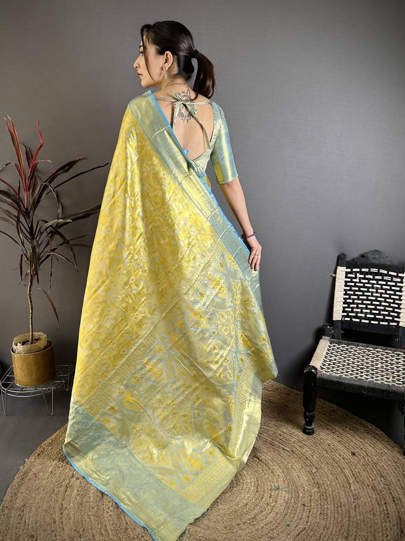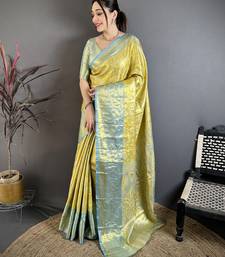 Yellow, blue floral, paisely, zari woven kanjivaram semi silk saree with blouse