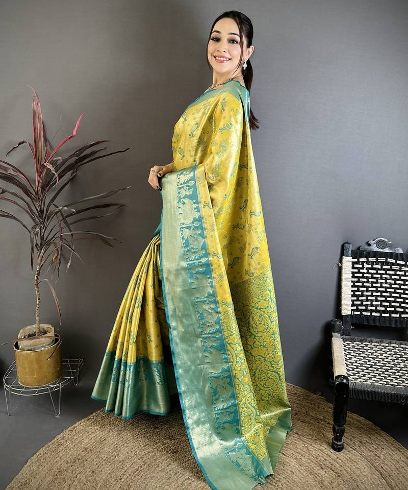 Yellow floral, paisely, zari woven banarasi silk saree with blouse