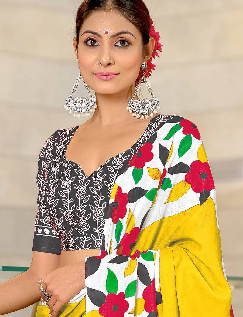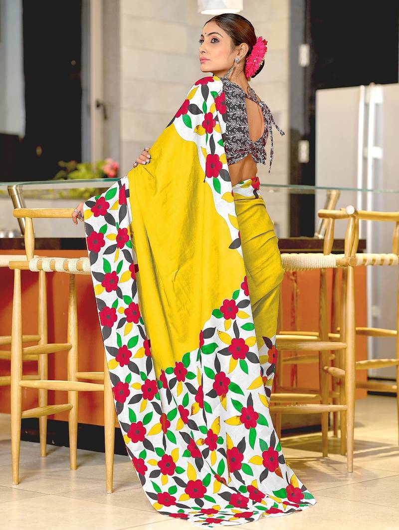 | Product Name | Yellow Floral Print Mulmul Cotton Saree With Blouse. | |