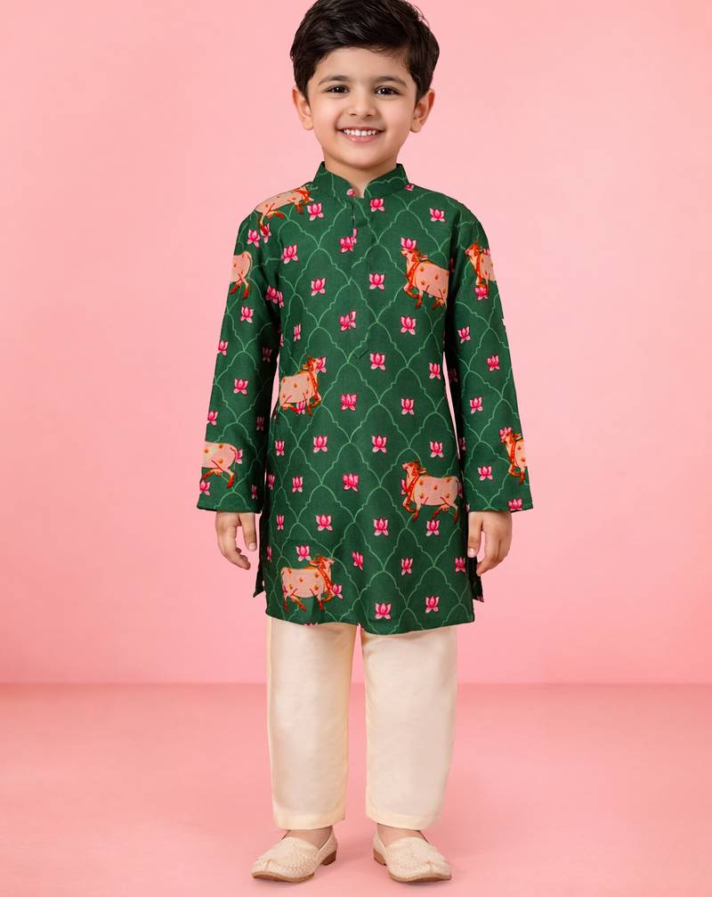 | Product Description | Celebrate Tradition With A Contemporary Twist In This Boys’ Kurta Set Featuring An Exclusive Pichwai Cow Print. Crafted In Breathable Cotton Fabric, The Green Kurta Showcases Intricate Digital Animal And Floral Motifs Inspired By Indian Art, Making It A Standout Choice For Weddings And Festive Occasions.