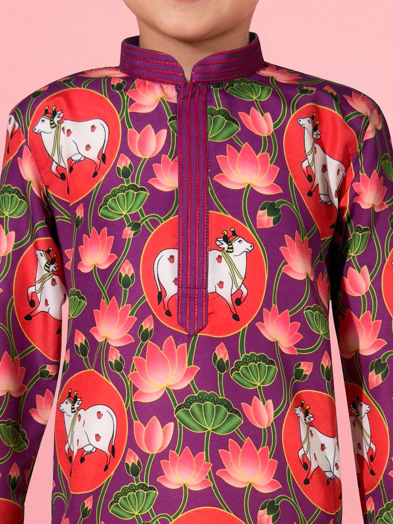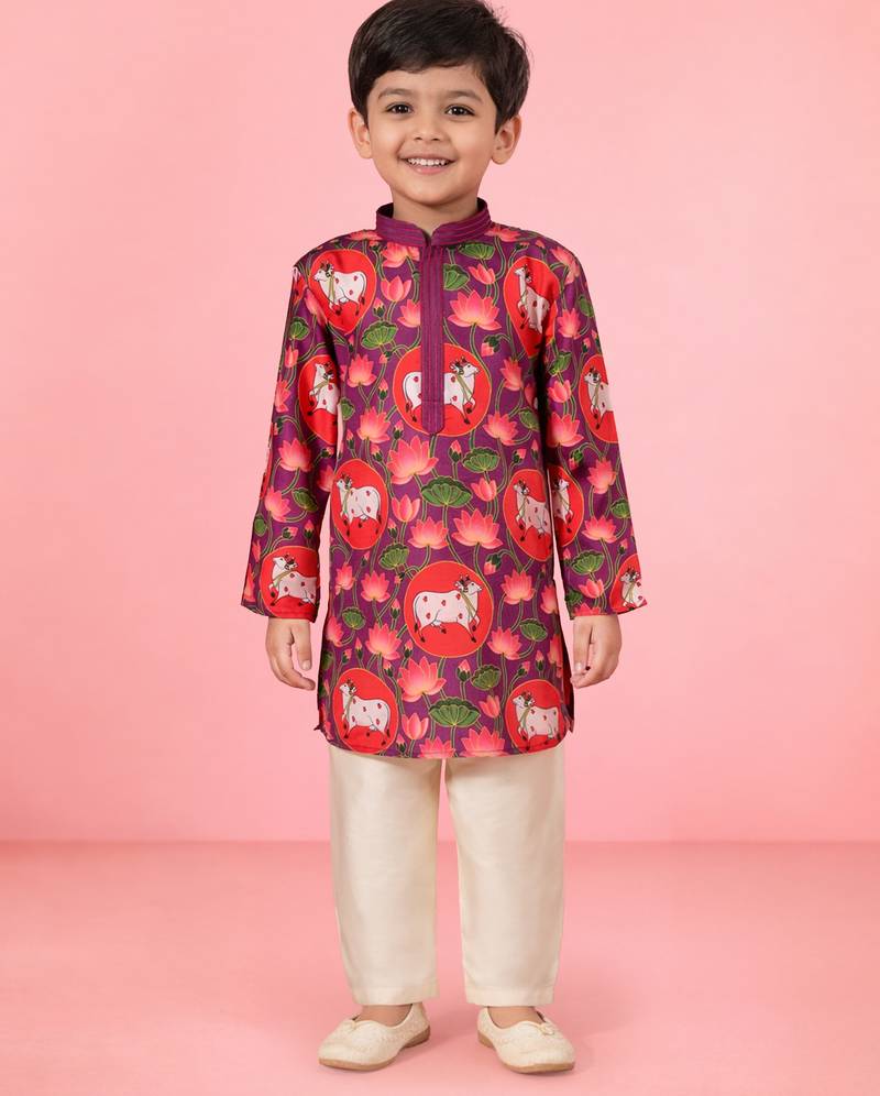 | Product Description | Make A Refined Ethnic Statement With This Boys’ Kurta Set Featuring An Elegant Pichwai Cow And Lotus Print. Crafted In Lightweight Muslin Fabric, The Purple Kurta Is Adorned With Intricate Digital Floral Inspired Artwork, Reflecting Traditional Indian Aesthetics With A Modern Touch.