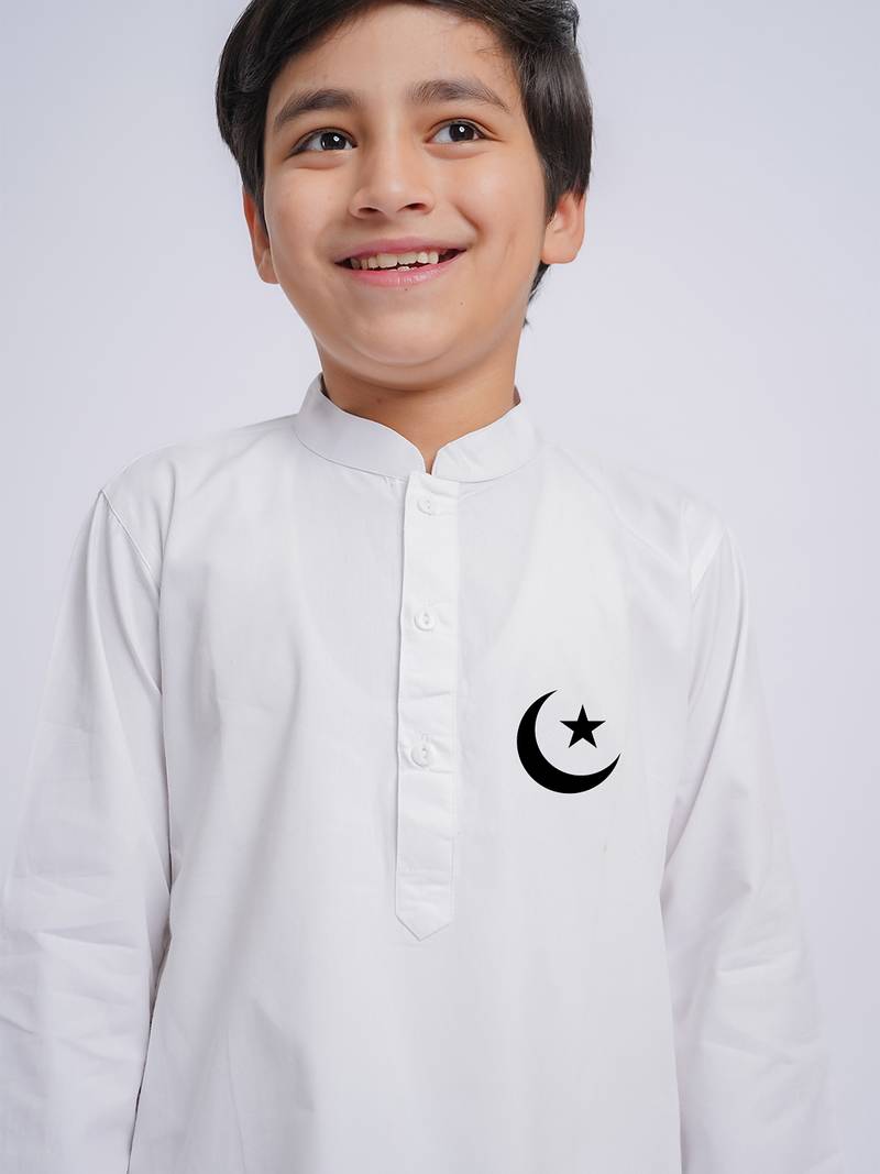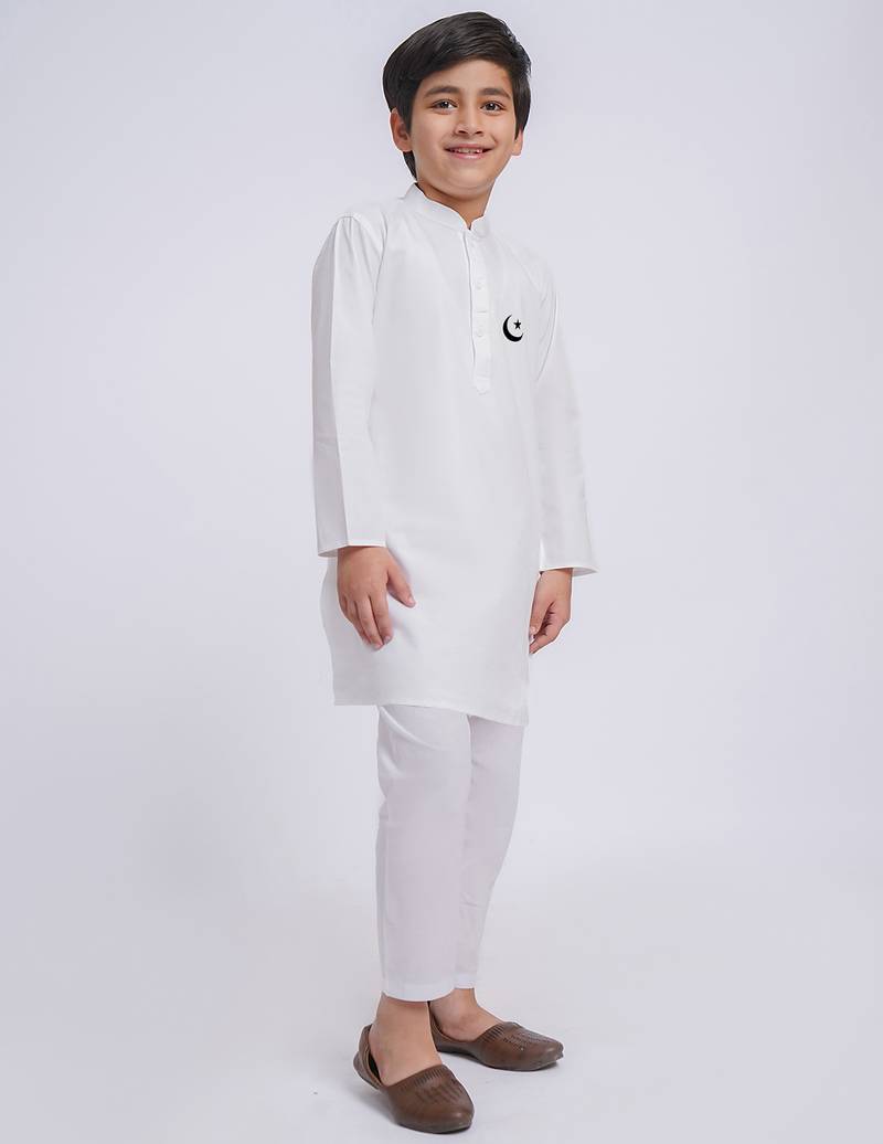 | Product Name | Boys White Pure Cotton Kurta Pyjama Set With Eid Mubarak Print | |