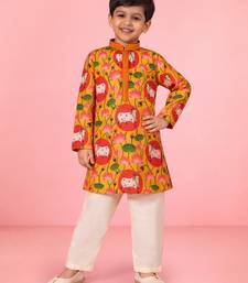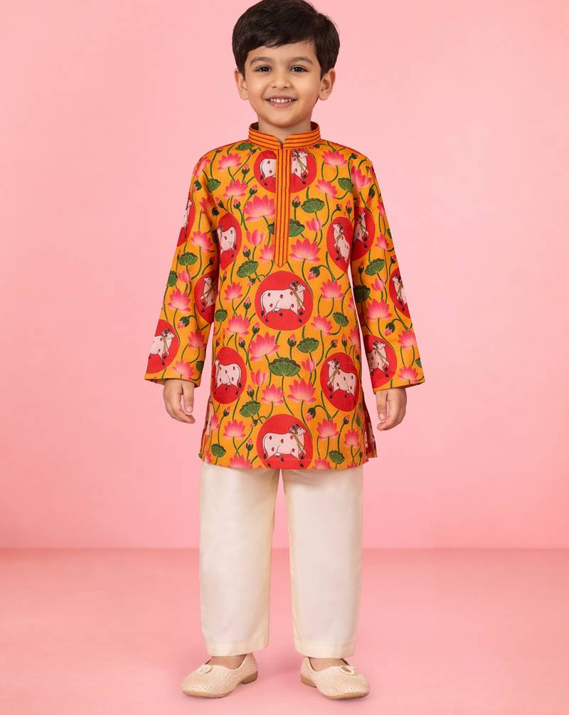 | Product Name | Boys Yellow Pichwai Print Muslin Kurta With Cream Pyjama Wedding & Festive Wear | |