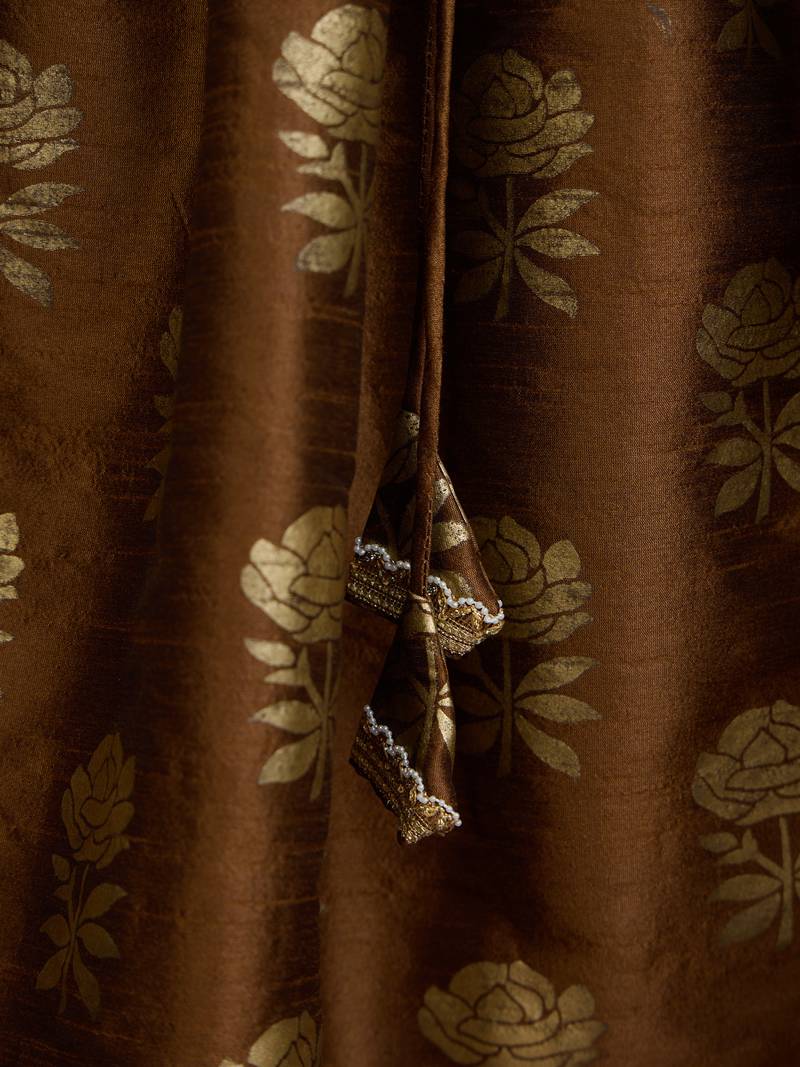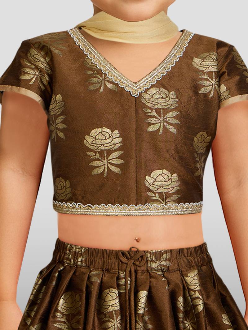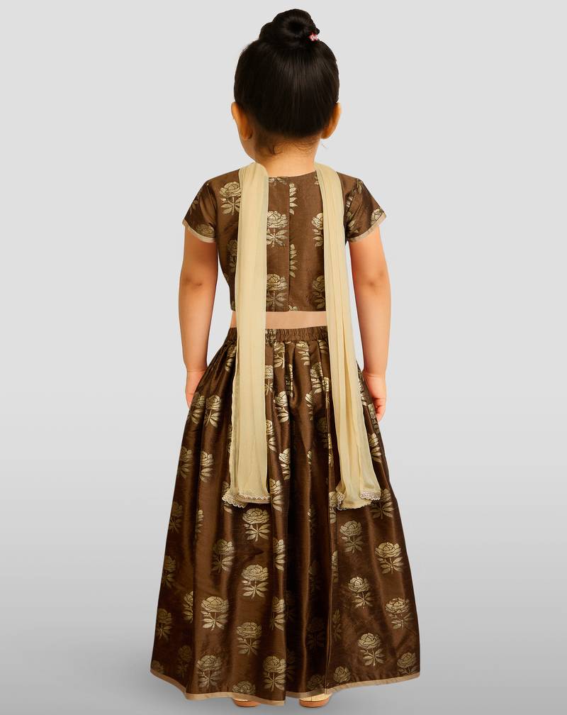 | Product Description | Elegant Coffee Dupion Silk Lehenga Set With Rose Gold Foil Floral Print. Features V Neck Crop Top With Hook And Eye Closure, Elasticated Lehenga Skirt, And Chiffon Dupatta. Perfect For Diwali, Janmashtami, And Festive Celebrations. |