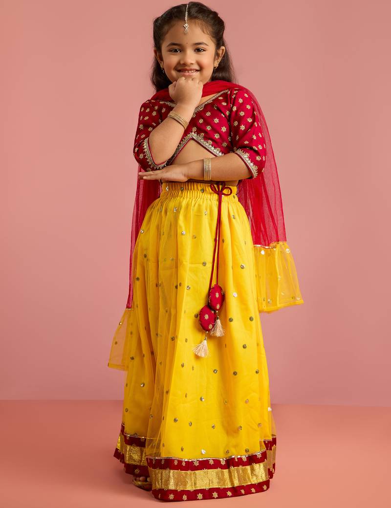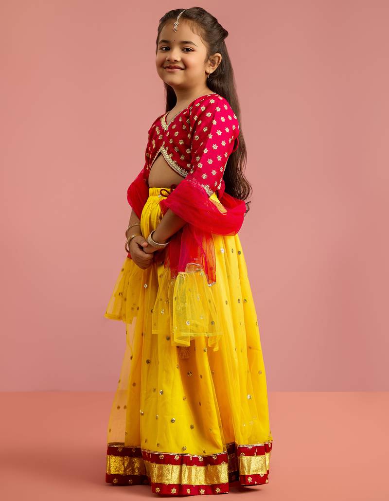 | Product Description | Let Your Girl Step Into Celebrations With This Sparkling Wedding Ready Lehenga Set From . Brand: Color: Elegant Ethnic Shade Falsa With Yellow Contrast Fabric: Premium Festive Net Fabric With Soft Crepe Lining Work: Trendy Sequin Embellished Cropped Choli Pattern: Graceful Floral Foil Print All Over Neck: Stylish V Neck Design Sleeves: Comfortable Glass Sleeves Choli Length: Modern Cropped Length Closure: Secure Hook And Eye Fastening Lehenga Fit: Flared Net Lehenga With Elasticated Waistband Occasion Wear: Ideal For Weddings, Diwali, Navratri, Janmashtami, Durga Puja And Festive Events Sizes Available: Girls 22 To 30 Designed With Lightweight Material And Elegant Embellishments, This Outfit Ensures Kids Stay Comfortable While Looking Glamorous And Ethnic Perfect. |