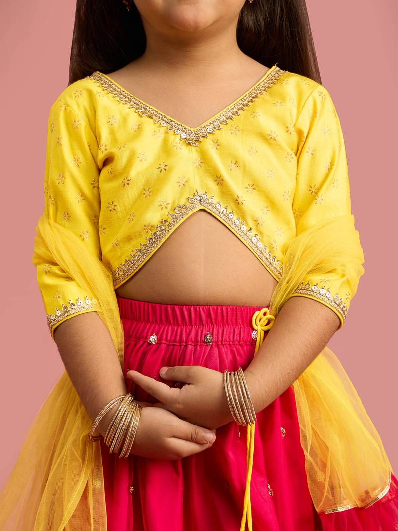 | Product Description | Let Your Girl Step Into Celebrations With This Sparkling Wedding Ready Lehenga Set From . Brand: Color: Elegant Ethnic Shade Falsa With Yellow Contrast Fabric: Premium Festive Net Fabric With Soft Crepe Lining Work: Trendy Sequin Embellished Cropped Choli Pattern: Graceful Floral Foil Print All Over Neck: Stylish V Neck Design Sleeves: Comfortable Glass Sleeves Choli Length: Modern Cropped Length Closure: Secure Hook And Eye Fastening Lehenga Fit: Flared Net Lehenga With Elasticated Waistband Occasion Wear: Ideal For Weddings, Diwali, Navratri, Janmashtami, Durga Puja And Festive Events Sizes Available: Girls 22 To 30 Designed With Lightweight Material And Elegant Embellishments, This Outfit Ensures Kids Stay Comfortable While Looking Glamorous And Ethnic Perfect. |