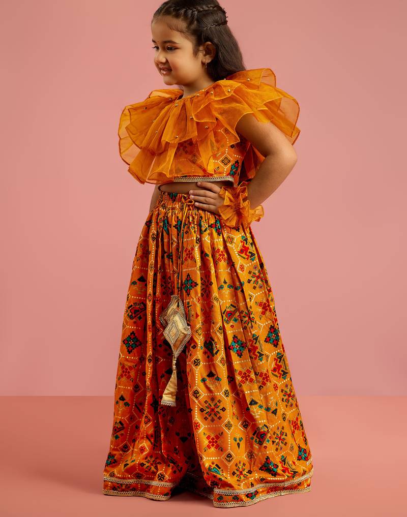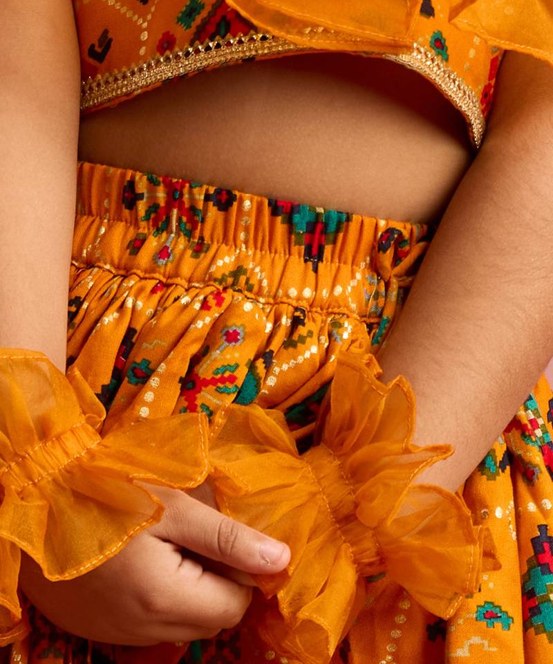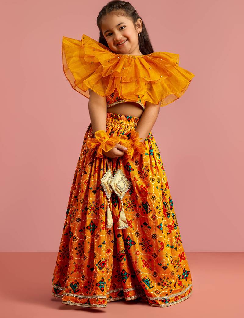 Girls mustard printed rayon patola lehenga choli set with ruffles & ruffled hand gloves
