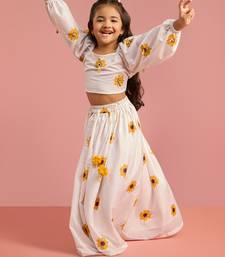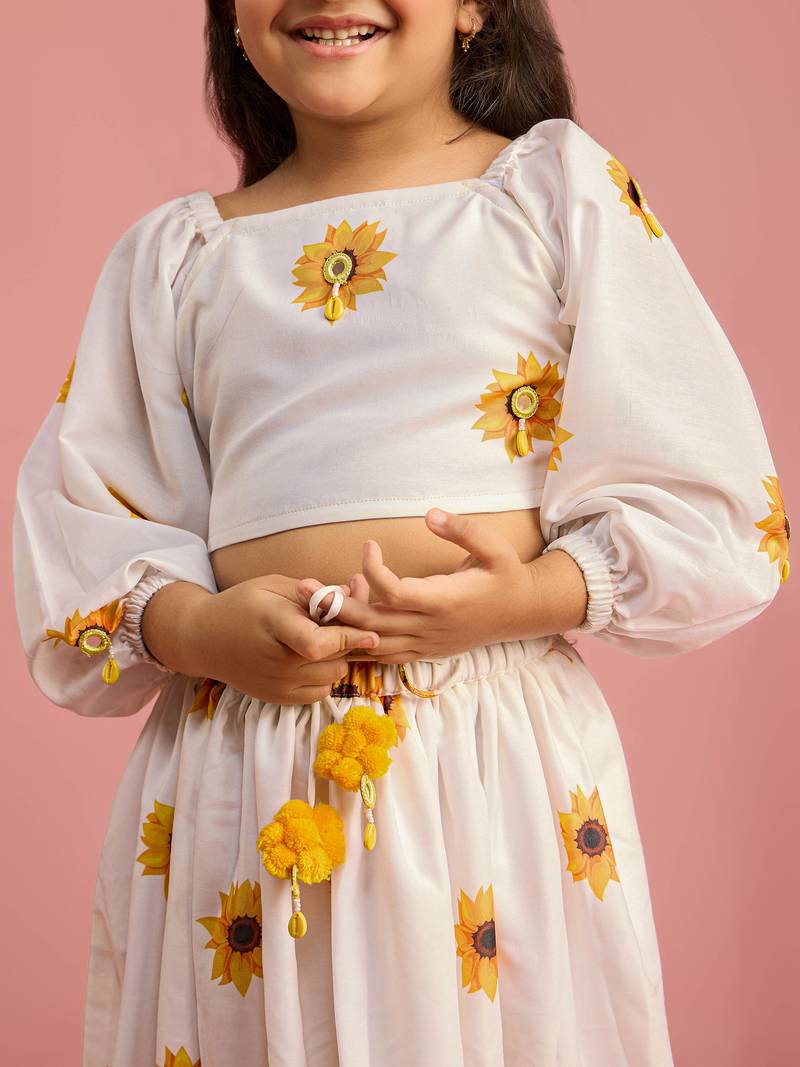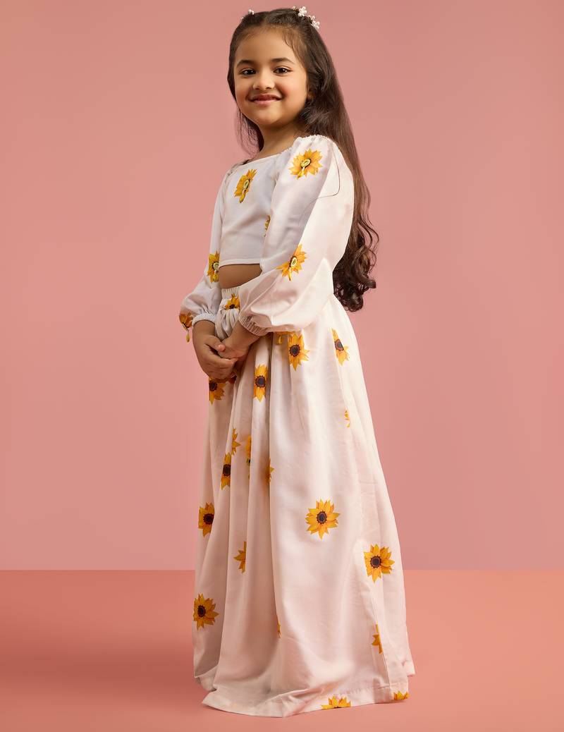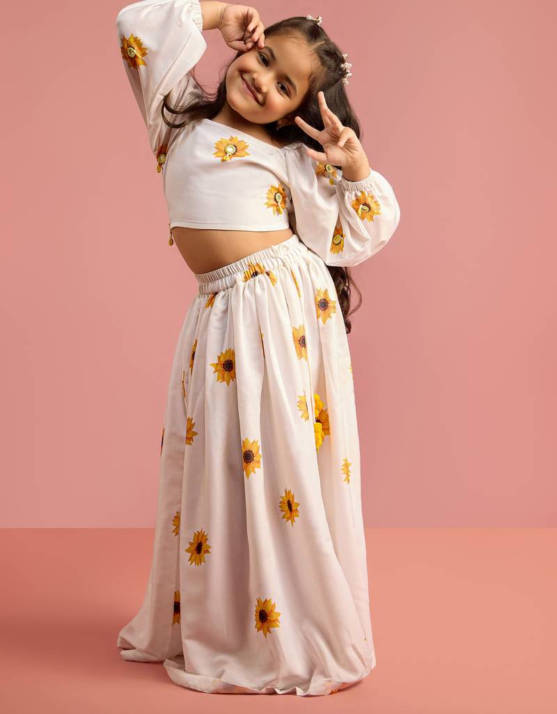 Girls white digital floral printed poly muslin lehenga choli set with square neck cropped top