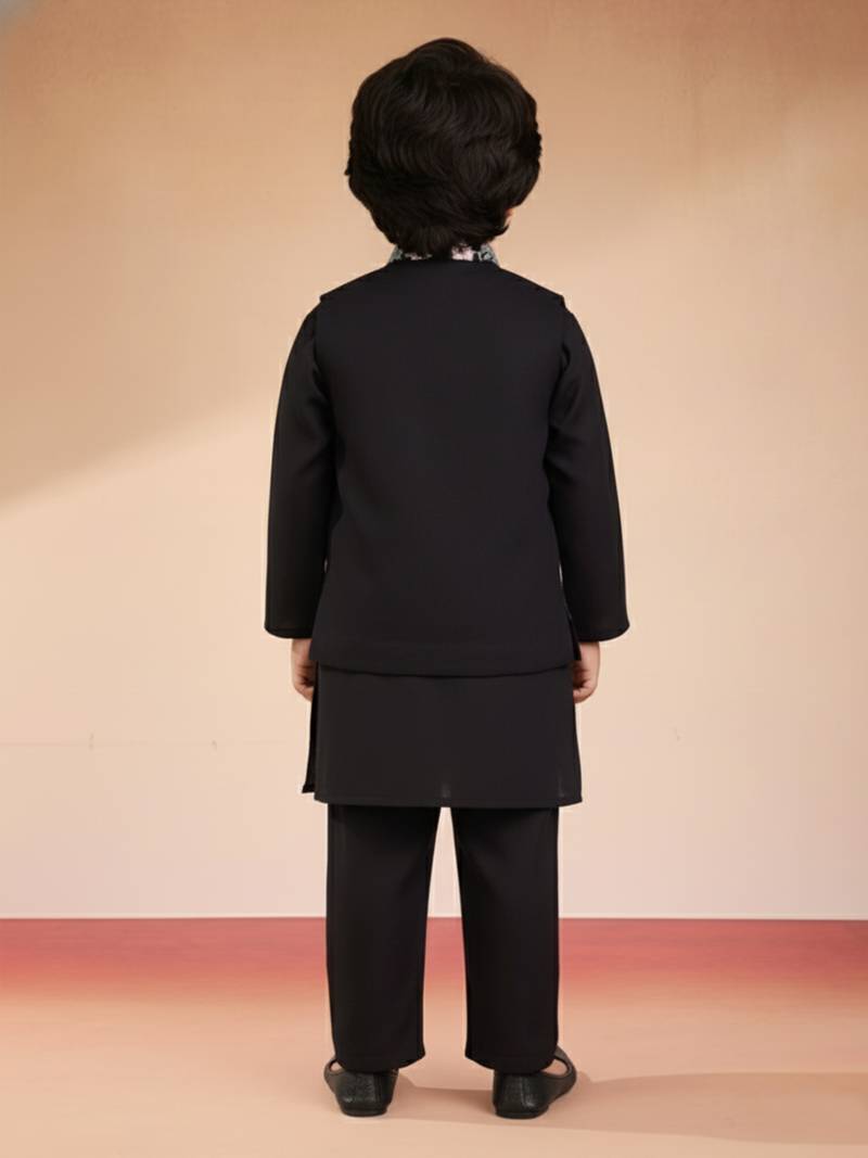 Silk blend embroidered nehru jacket set with pyjamas for boys| black | diwali