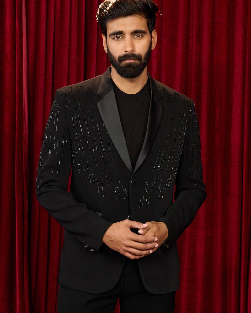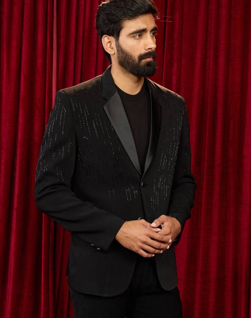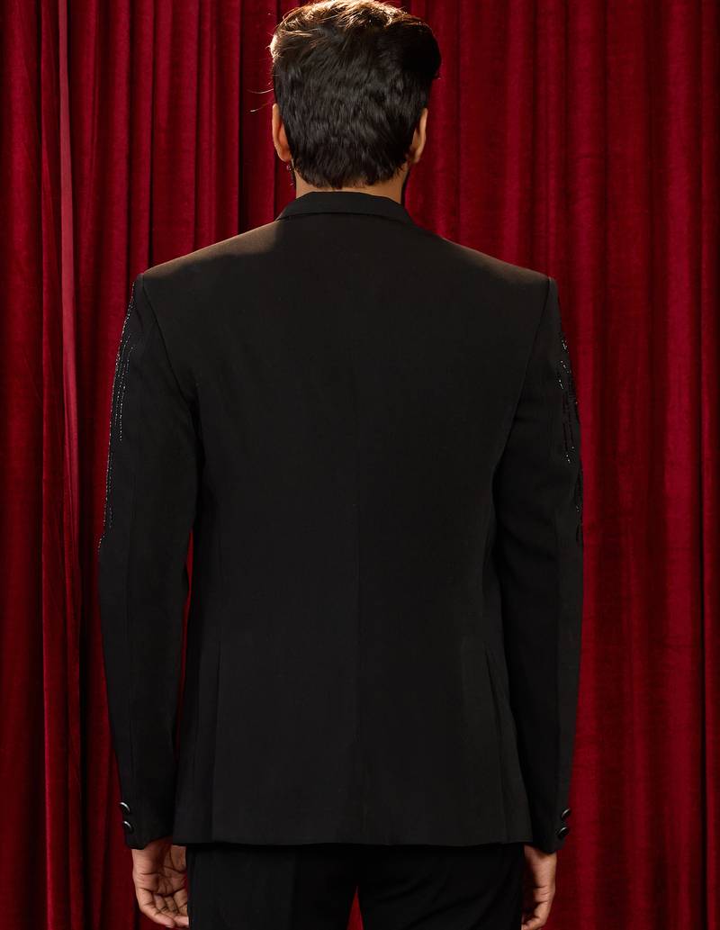Black cutdana work geometric notch collar wedding blazer | lachka mink suiting | satin lining