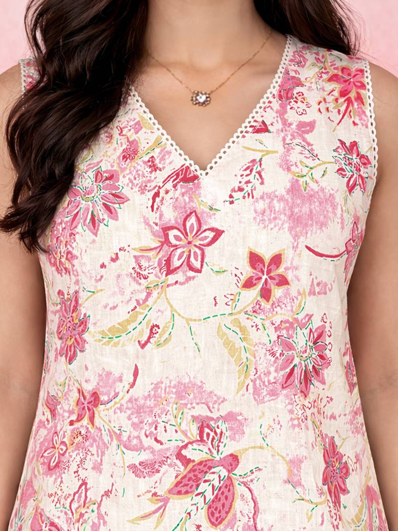 Vastramay women's pink floral screen print cambric cotton kurta | sleeveless v-neck straight ethnic wear