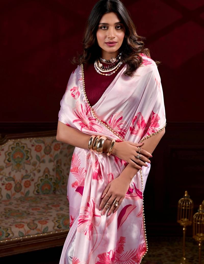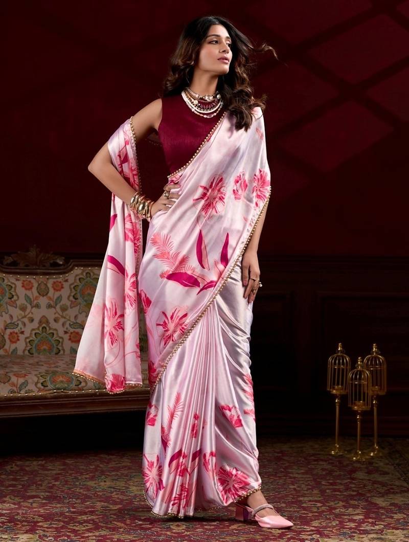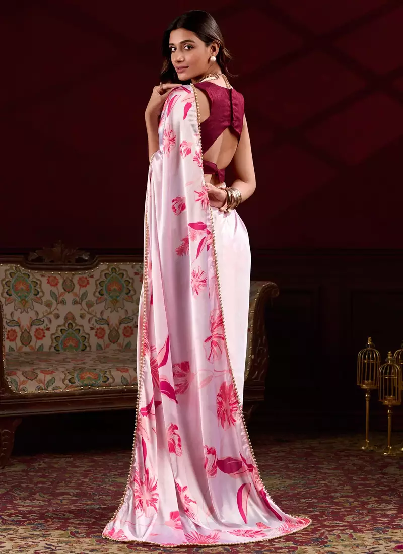| Product Name | Baby Pink Satin Silk Floral Printed With Pearl Lace Saree With Unstitched Blouse | |