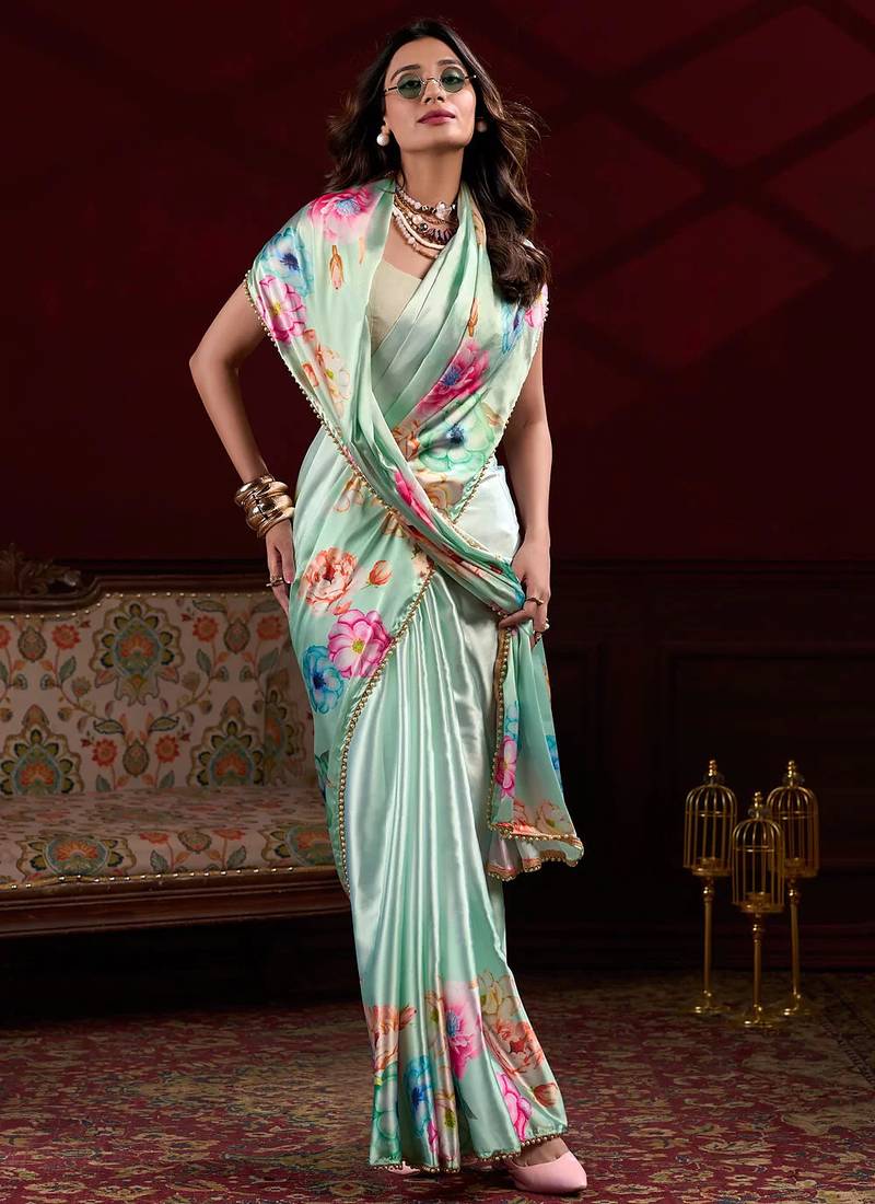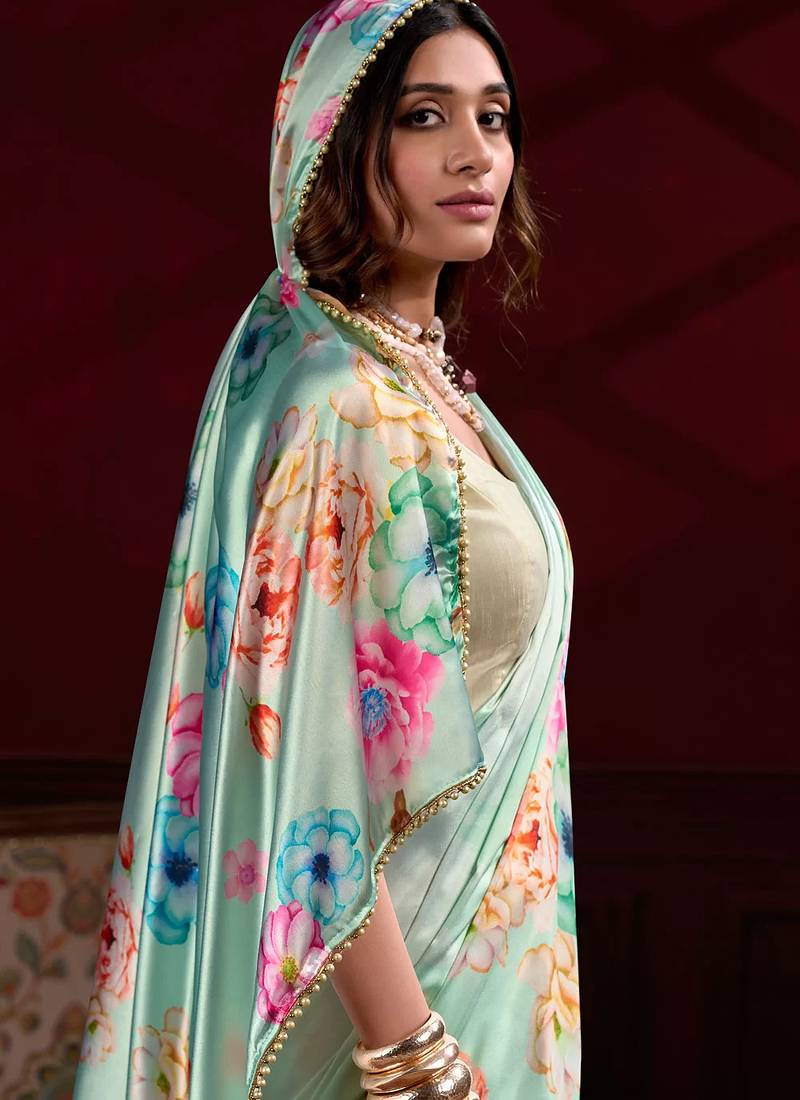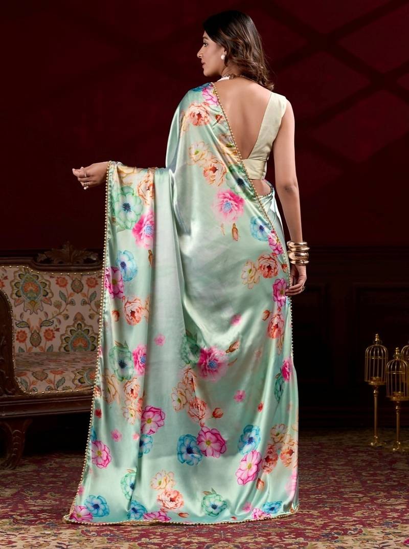 | Product Name | Pista Satin Silk Floral Printed With Pearl Lace Saree With Unstitched Blouse | |