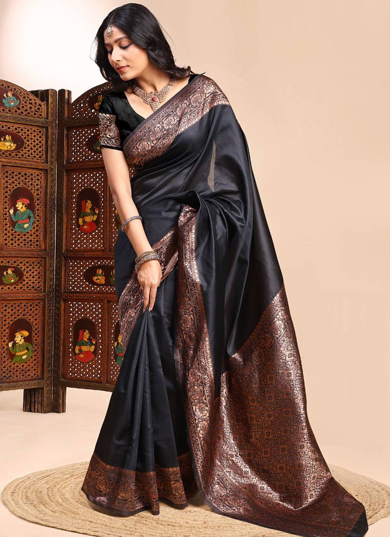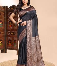 Black lichi silk embroidered wedding wear saree