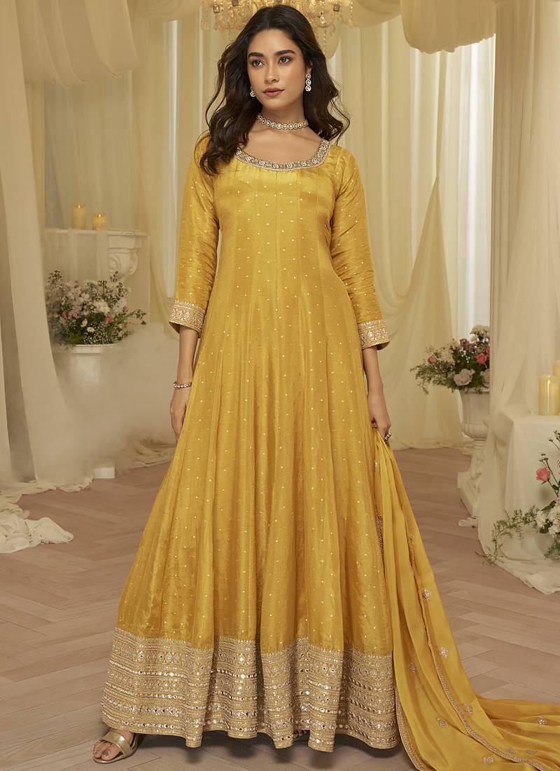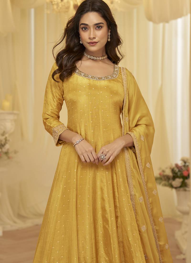Light-yellow embroidered viscos jacquard silk anarkali suit stitched