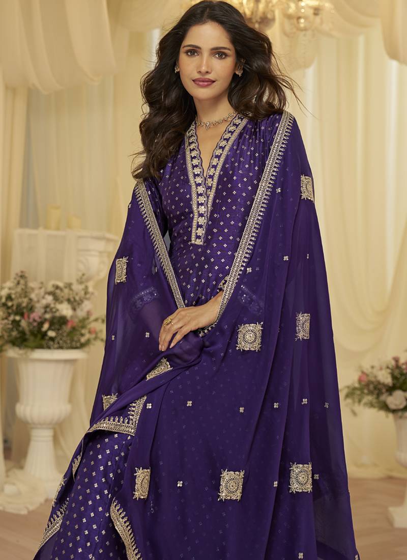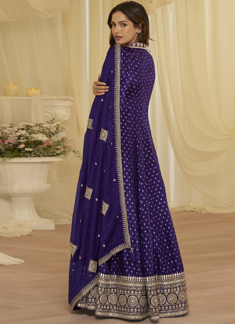 Purple embroidered viscos jacquard silk anarkali suit stitched