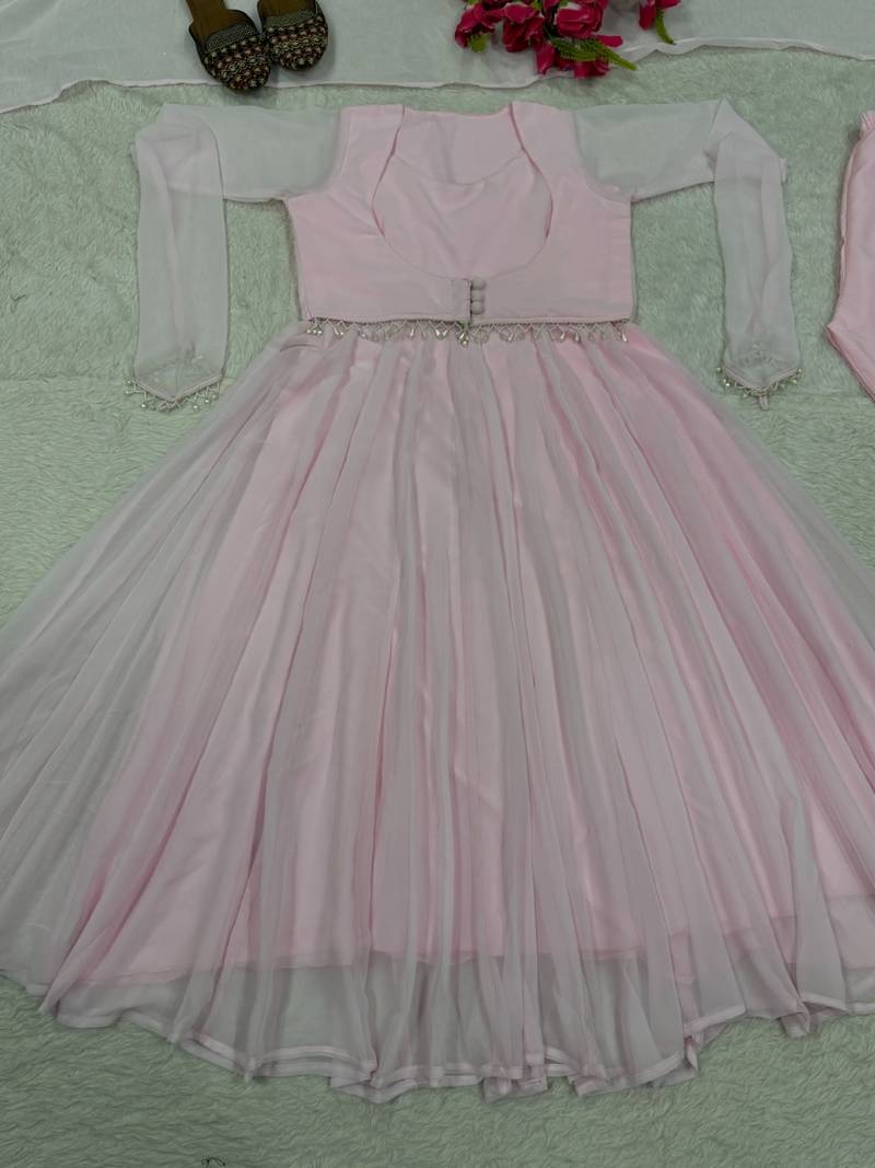 | Product Name | Baby Pink Embroidery Faux Georgette Fully Stitched Anarkali Suit Set | |