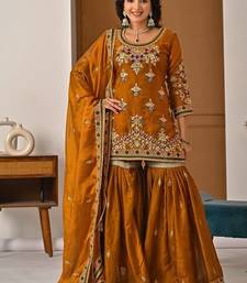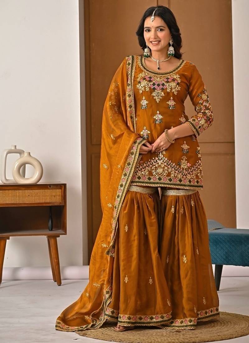 Copper embroidery fandy silk fully stitched sharara palazzo suit set