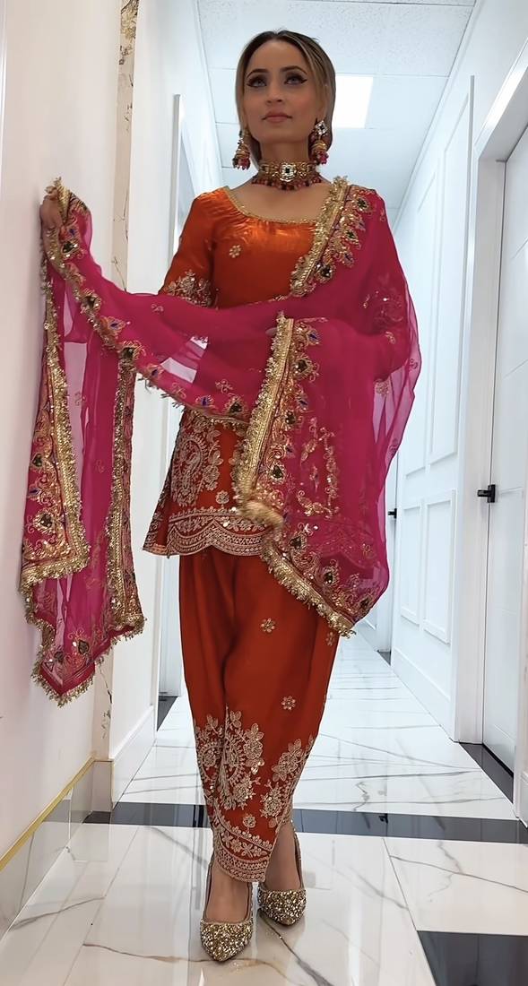 Orange embroidery fandy silk full stitched farshi salwar