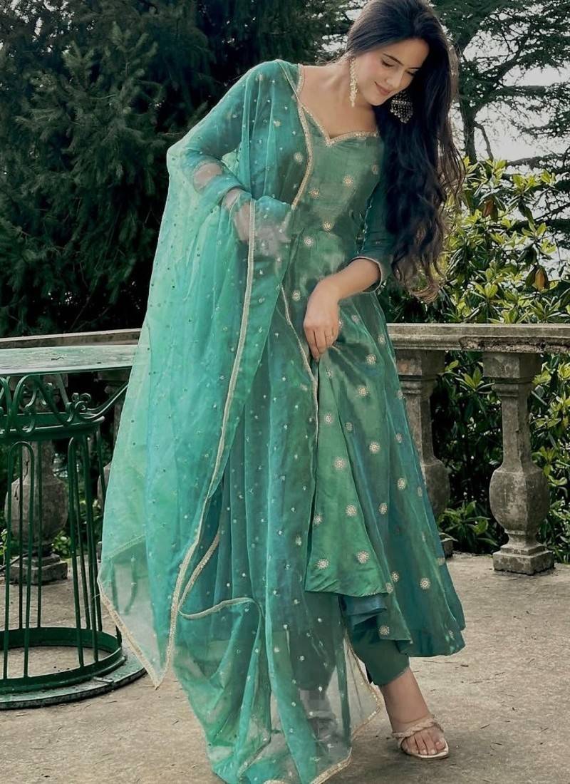 Sea green embroidery simmar silk fully stitched anarkali suit set