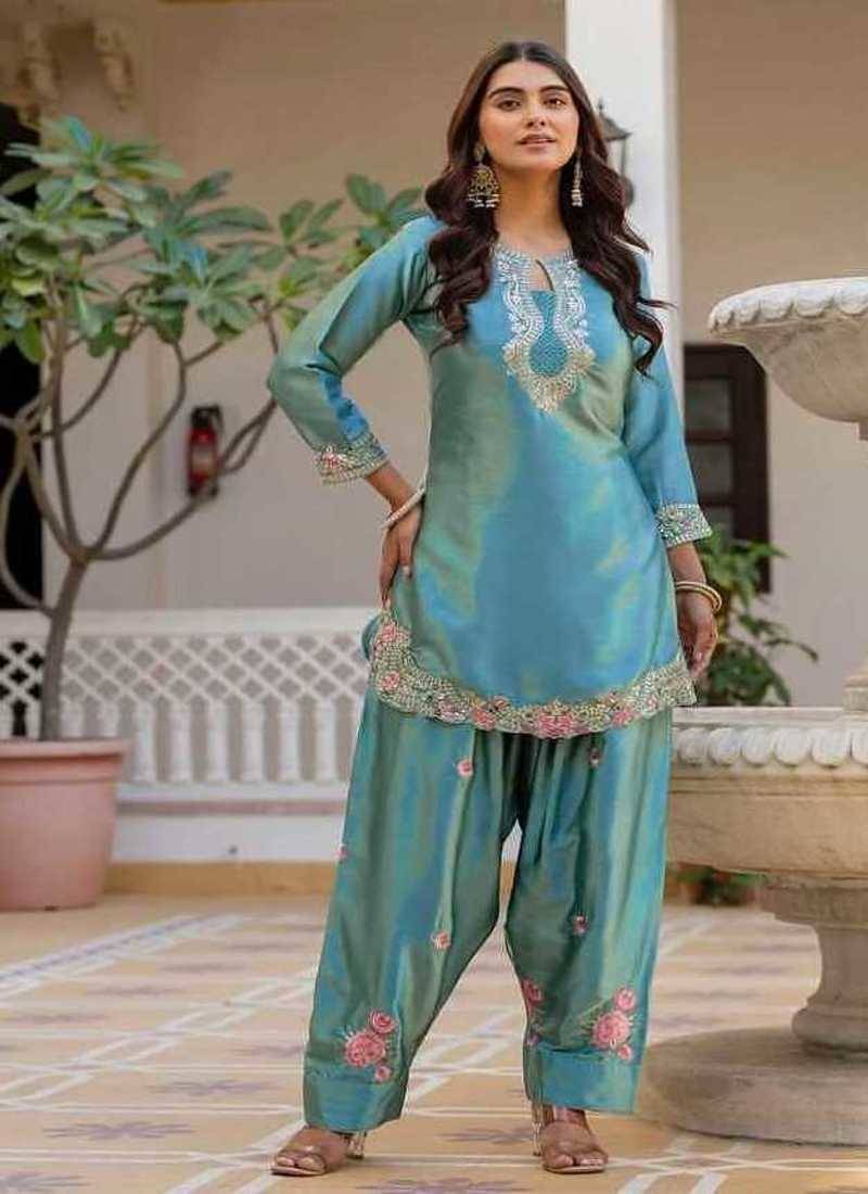 Sky blue embroidery japan satin fully stitched farshi salwar suit set