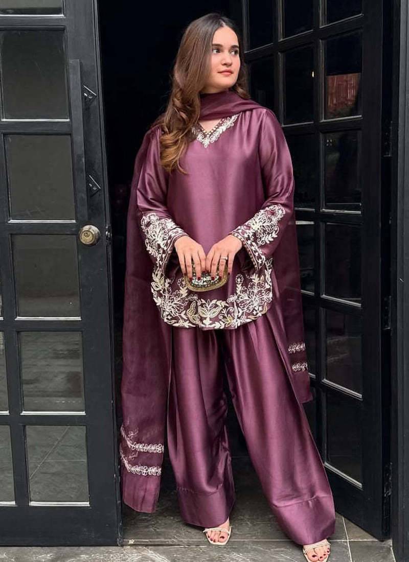 Wine embroidery crep silk full stitched farshi salwar