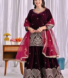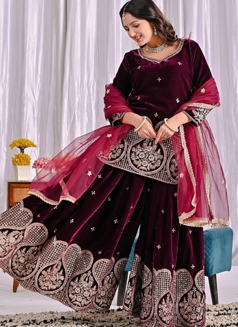 | Product Name | Wine Embroidery Viscous Velvet Fully Stitched Sharara Palazzo Suit Set | |
