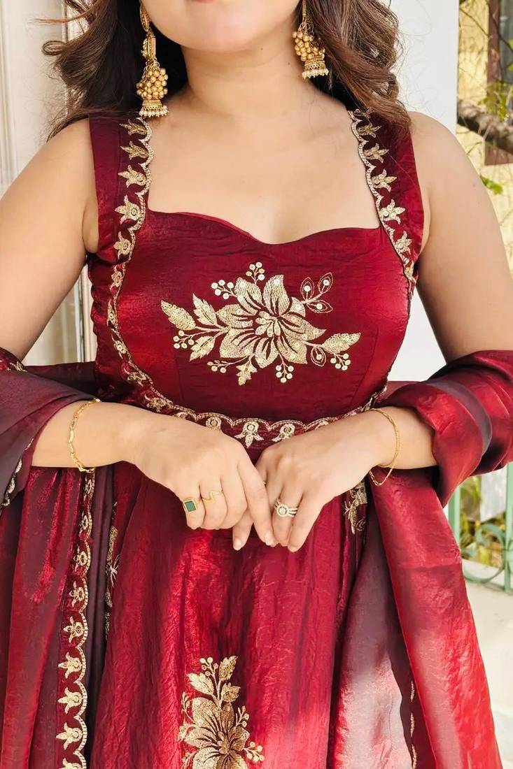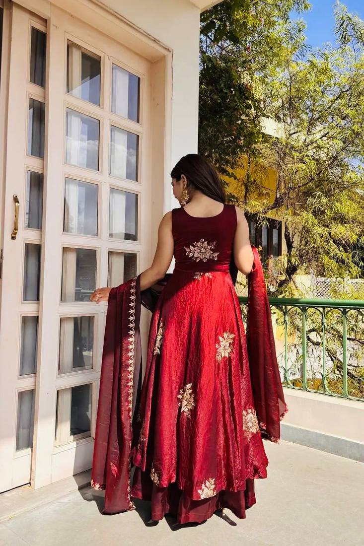 | Product Name | Maroon Fendy Silk Flared Gown Sharara Set With Sequence Embroidery & Dupatta | |