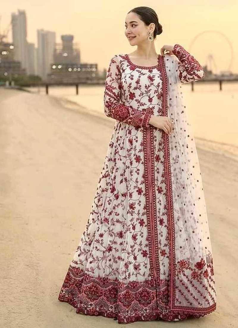 | Product Name | White And Maroon Faux Georgette Embroidered Gown Set With Organza Silk Dupatta | |