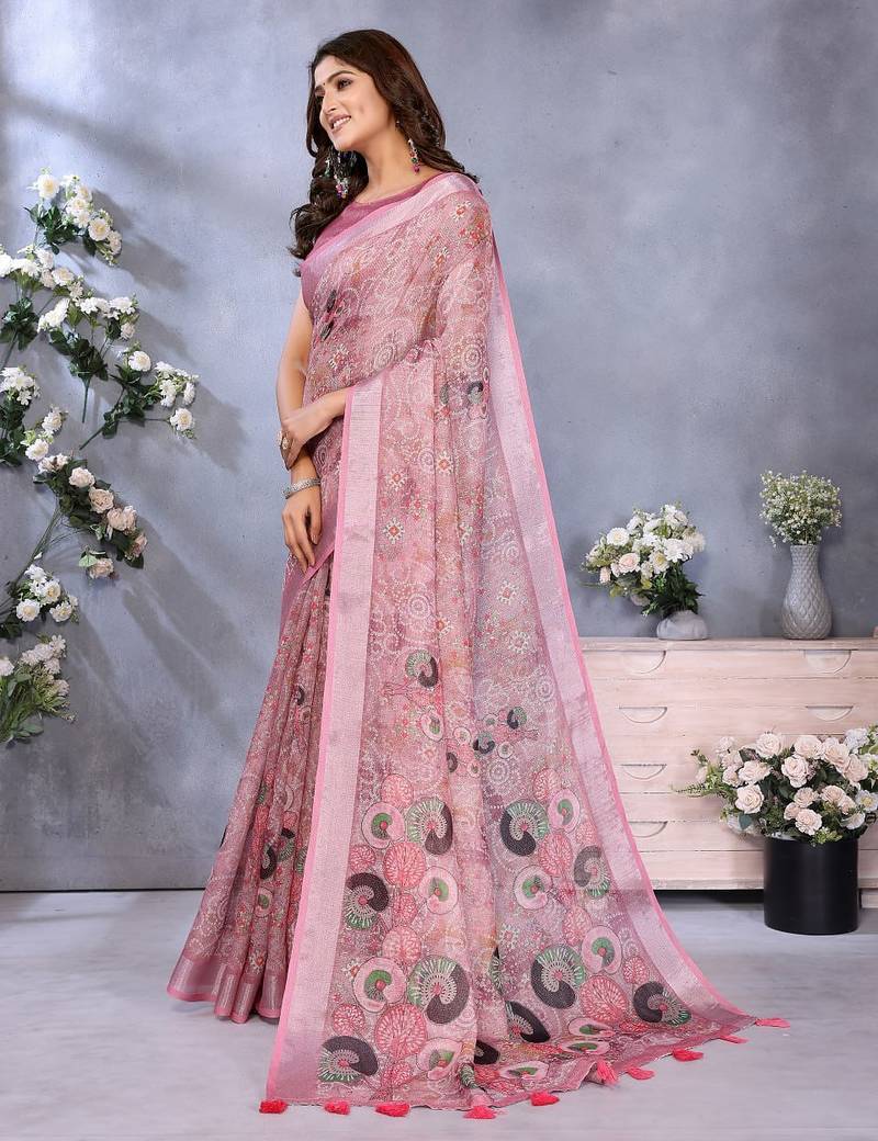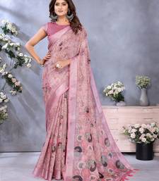 Baby pink printed art silk designer pallu saree