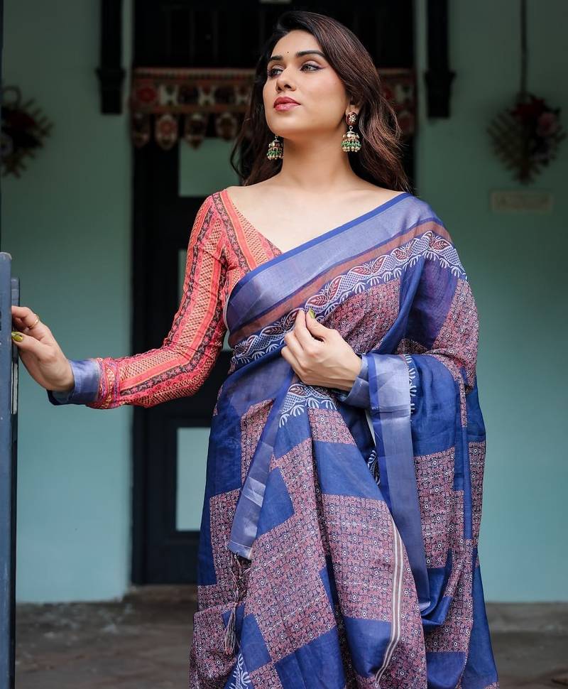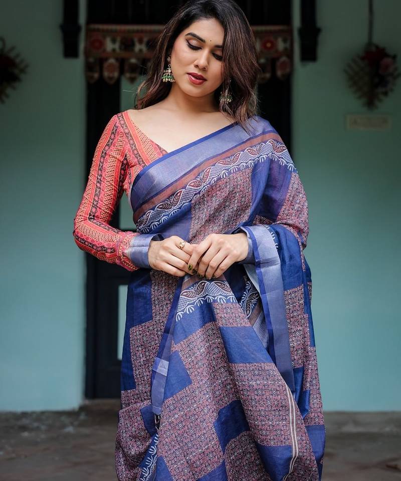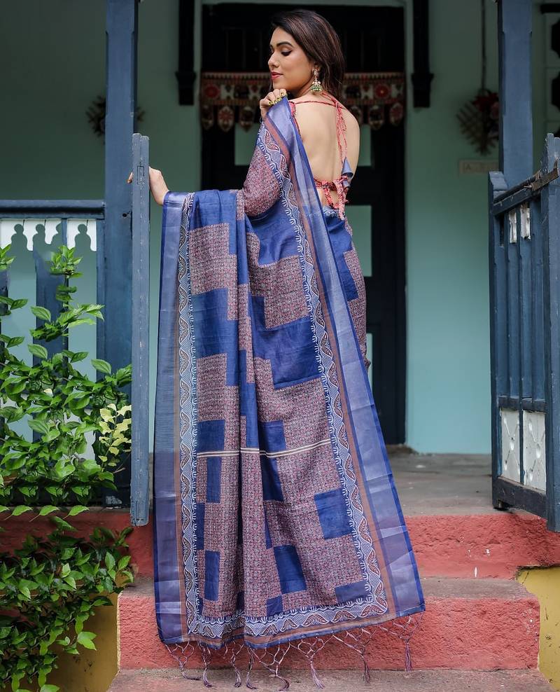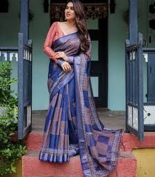 Blue printed art silk designer pallu saree