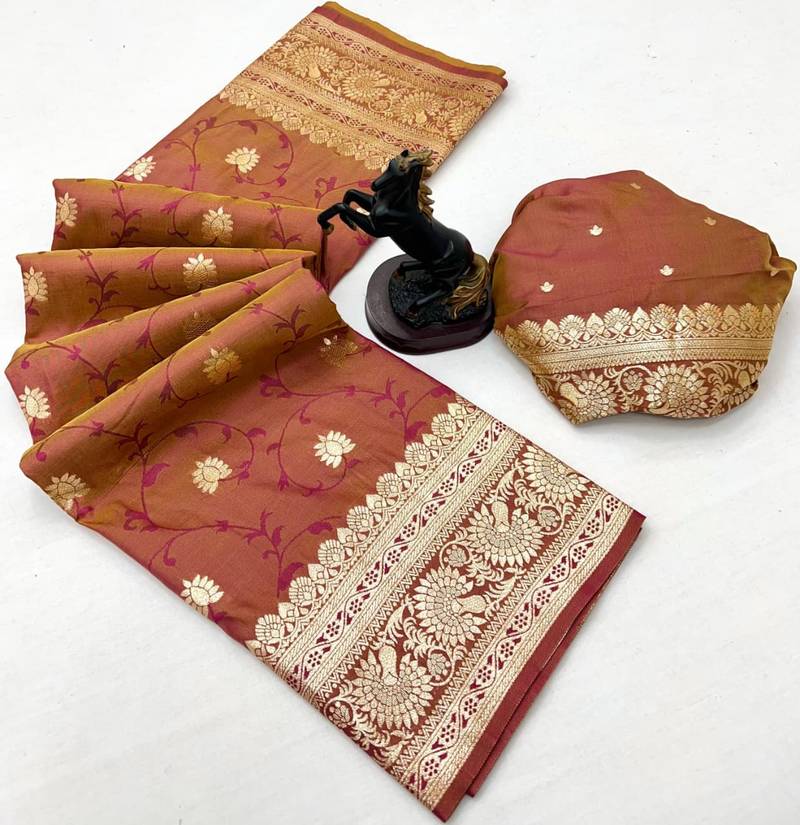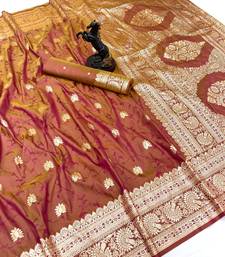 Brown banarasi silk saree with zari embossed jal design & rich pallu