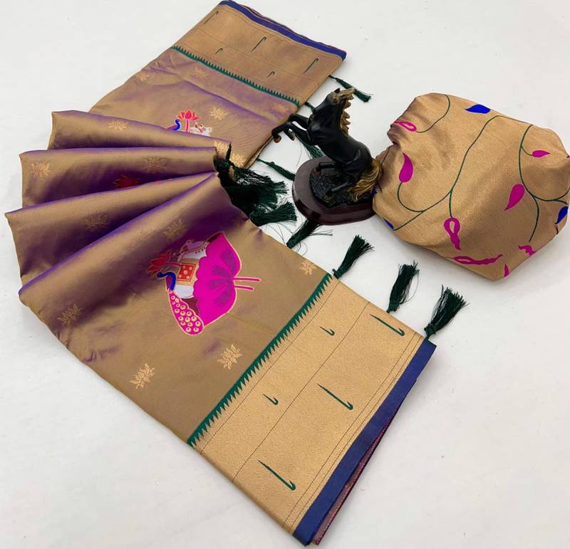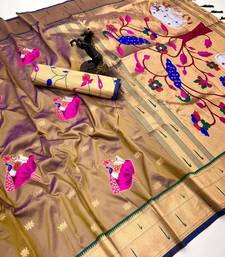 Brown soft silk pichwai paithani saree with lotus butta & double muniya border