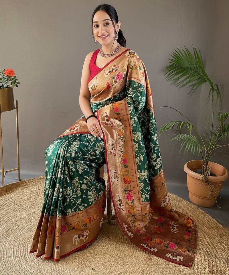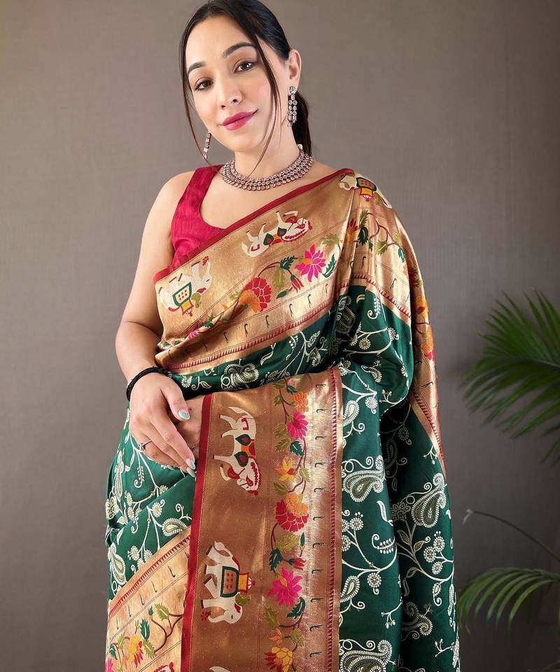 Dark green art silk woven saree