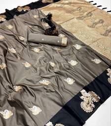 Dark grey soft silk saree with zari weaving & peacock motifs