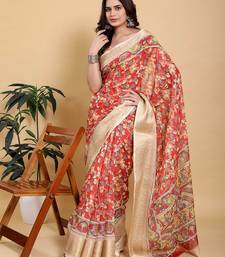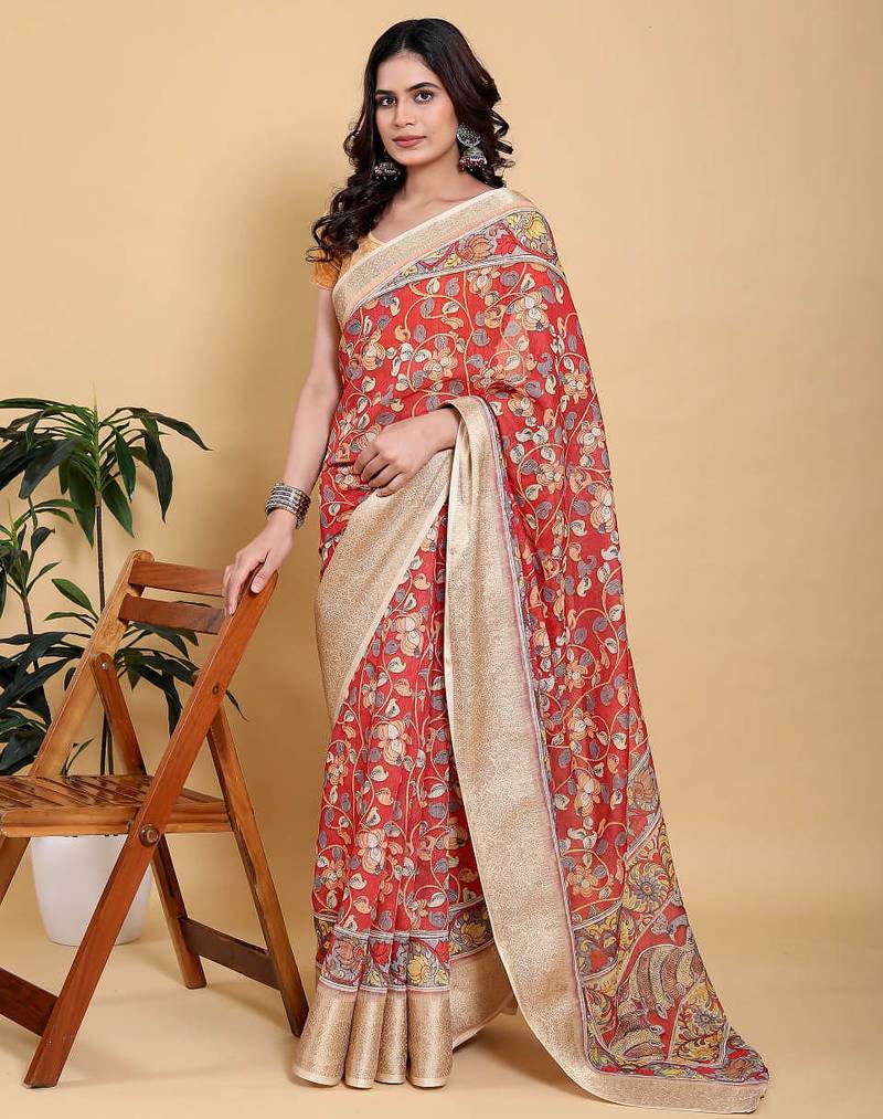 Dark orange printed art silk designer pallu saree