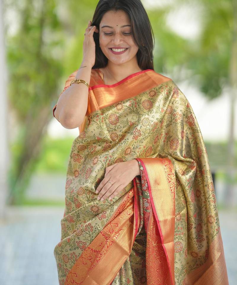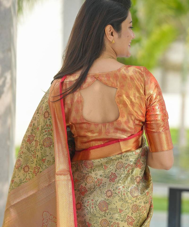 | • | Saree | : | Color- Mehendi / Fabric- Kanjivaram Silk |