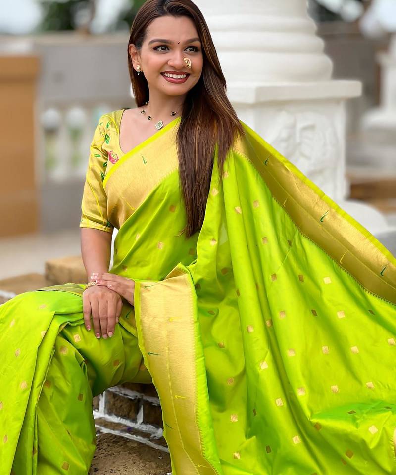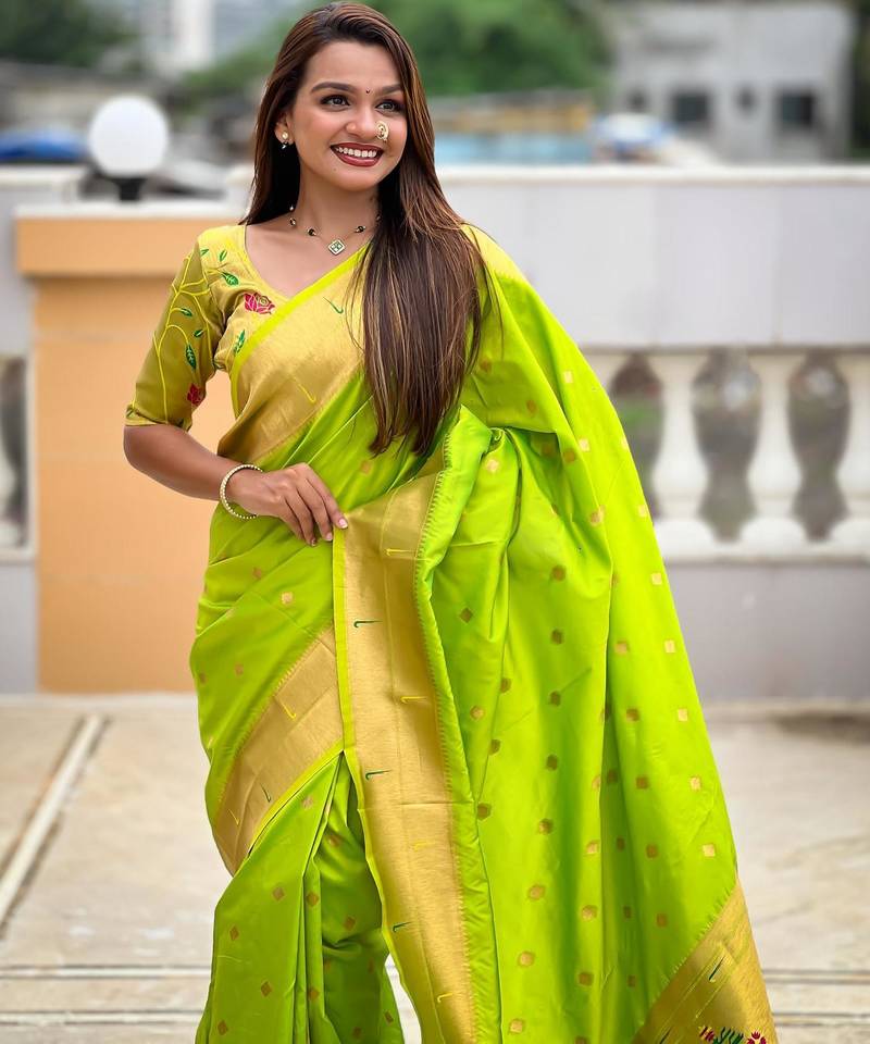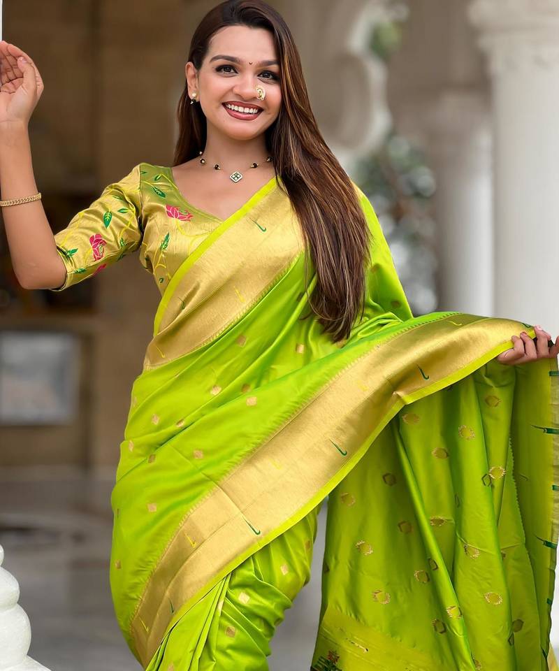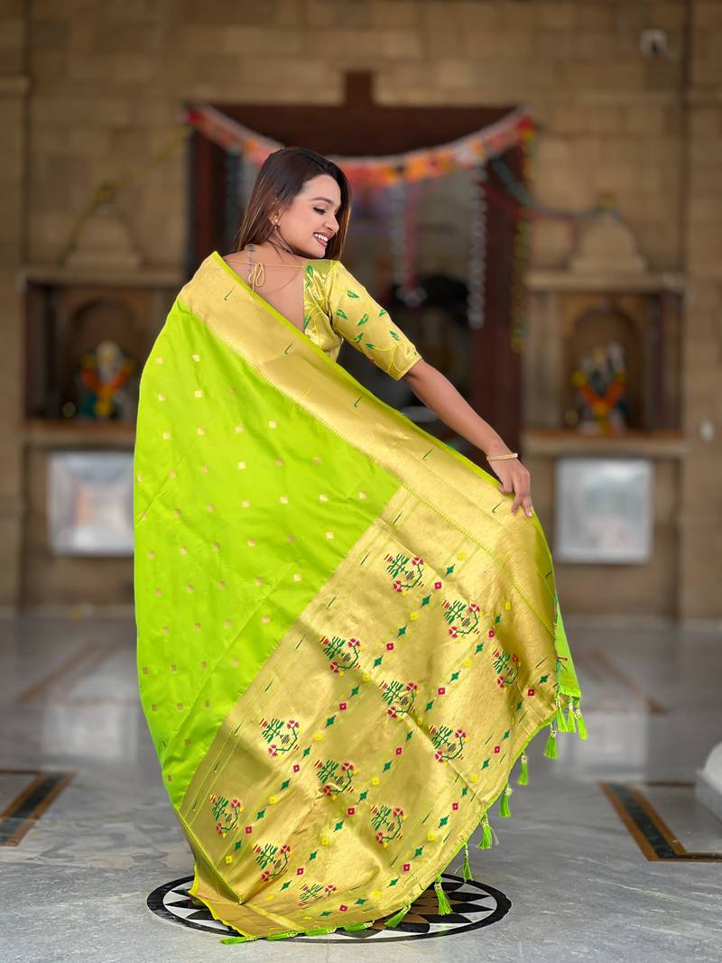 | Product Description | Soft Paithani Silk Saree With Zari Weawing Motifs Design And Meenakari Weawing Rich Pallu With Meenakari Weawing Double Munia Border & Tassels Attached At Pallu End. Blouse : Enrich Silk Weawing Blouse Piece With Sleeve Border , |