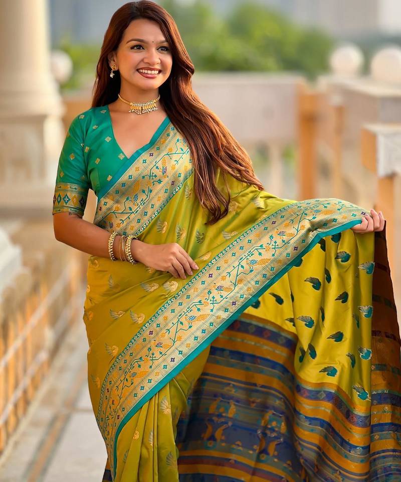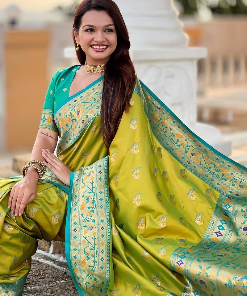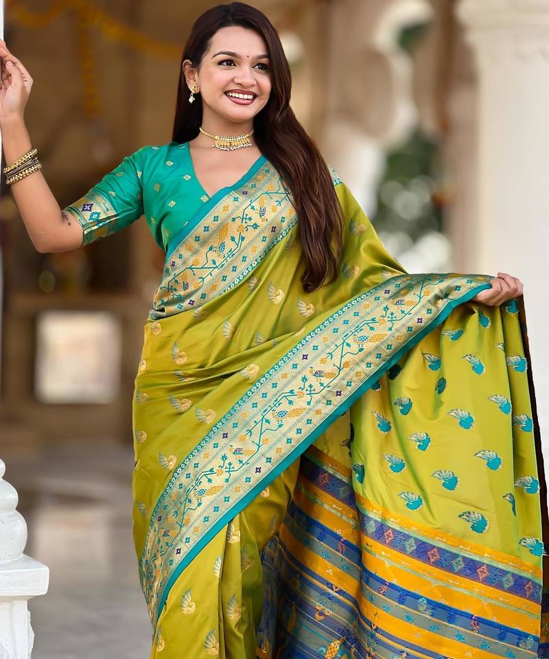 | Product Description | Soft Paithani Silk Saree With Zari Weawing Motifs Design And Meenakari Weawing Rich Pallu With Meenakari Weawing Border & Tassels Attached At Pallu End. Blouse : Enrich Silk Weawing Contrast Blouse Piece With Sleeve Border , |