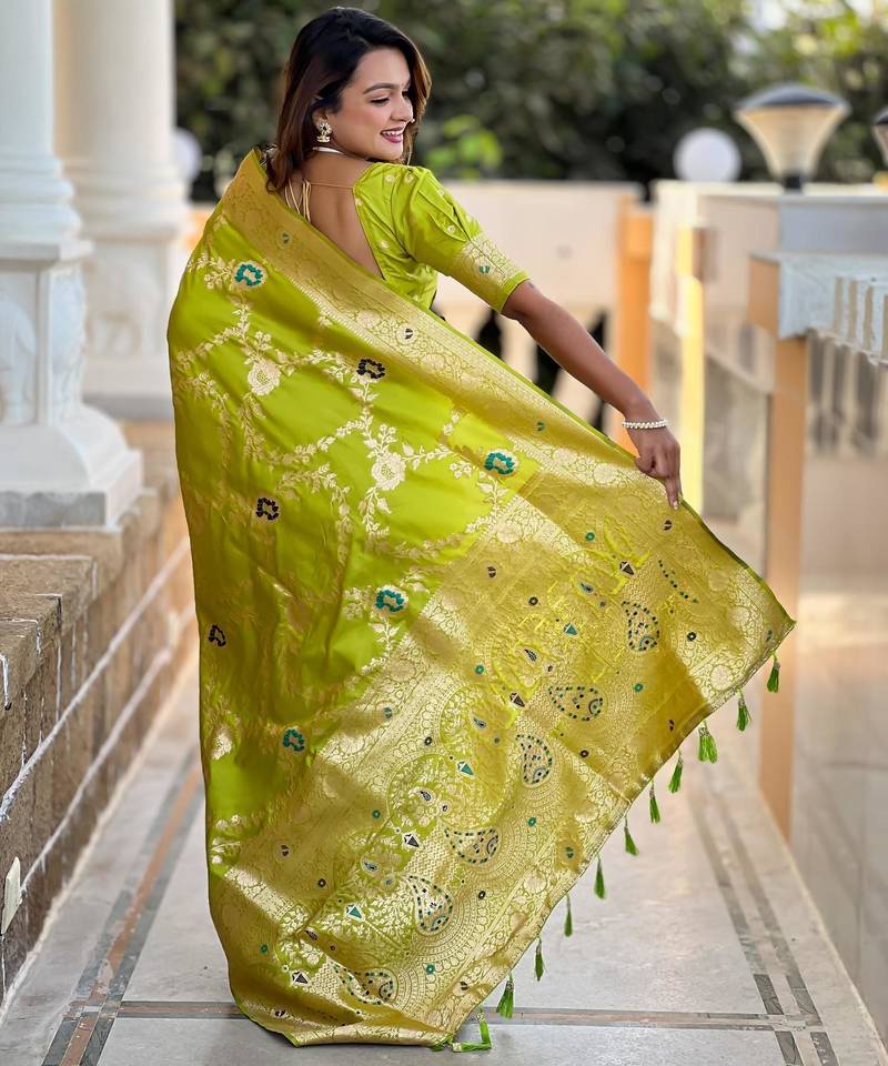 | Product Description | Soft Banarasi Silk Saree With Zari Weaving Meenakari Touchup Design All Over The Saree & Meenakari Weawing Rich Pallu With Meenakari Weawing Border & Tessels Attached At Pallu End. Blouse : Soft Silk Weawing Blouse Piece |