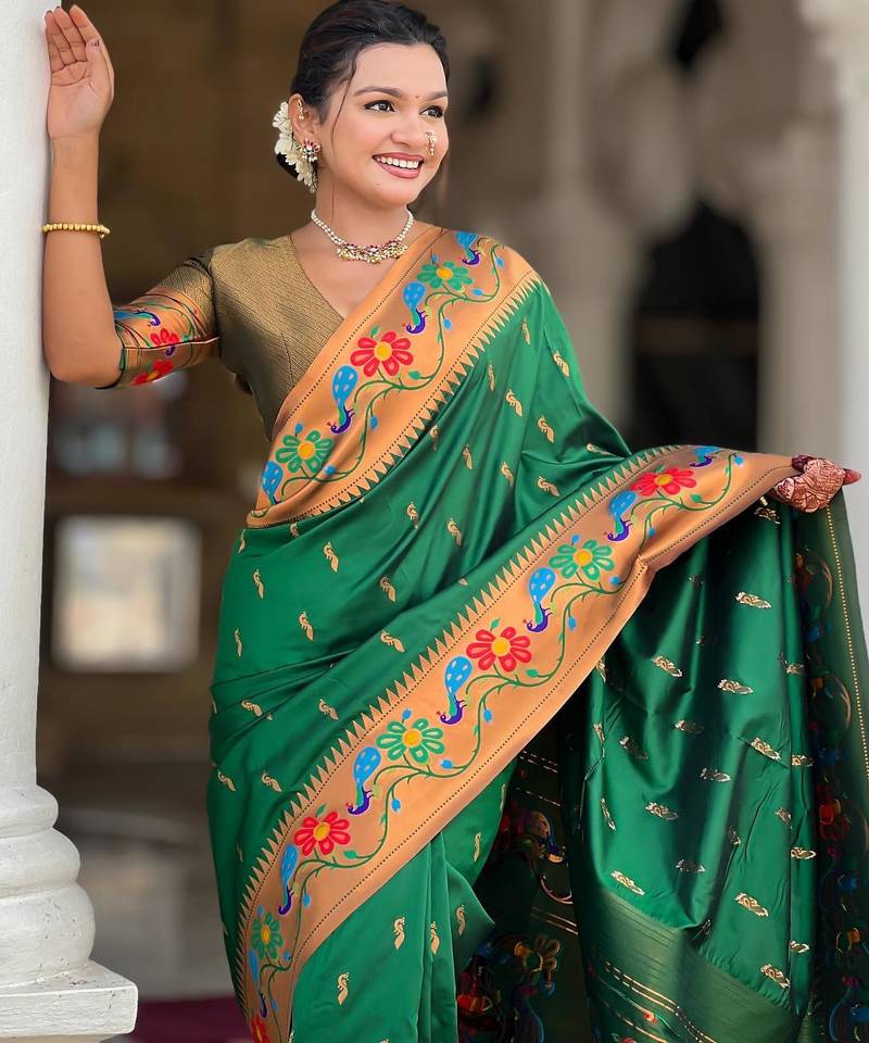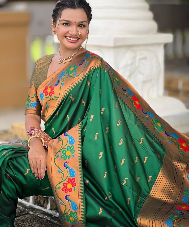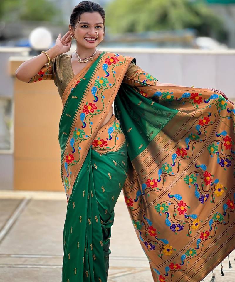 | Product Description | Soft Paithani Silk Saree With Zari Weawing Meenakari Motifs Design And Meenakari Weawing Rich Pallu With Meenakari Weawing Border & Tassels Attached At Pallu End. Blouse : Enrich Silk Weawing Contrast Blouse Piece With Sleeve Border , |