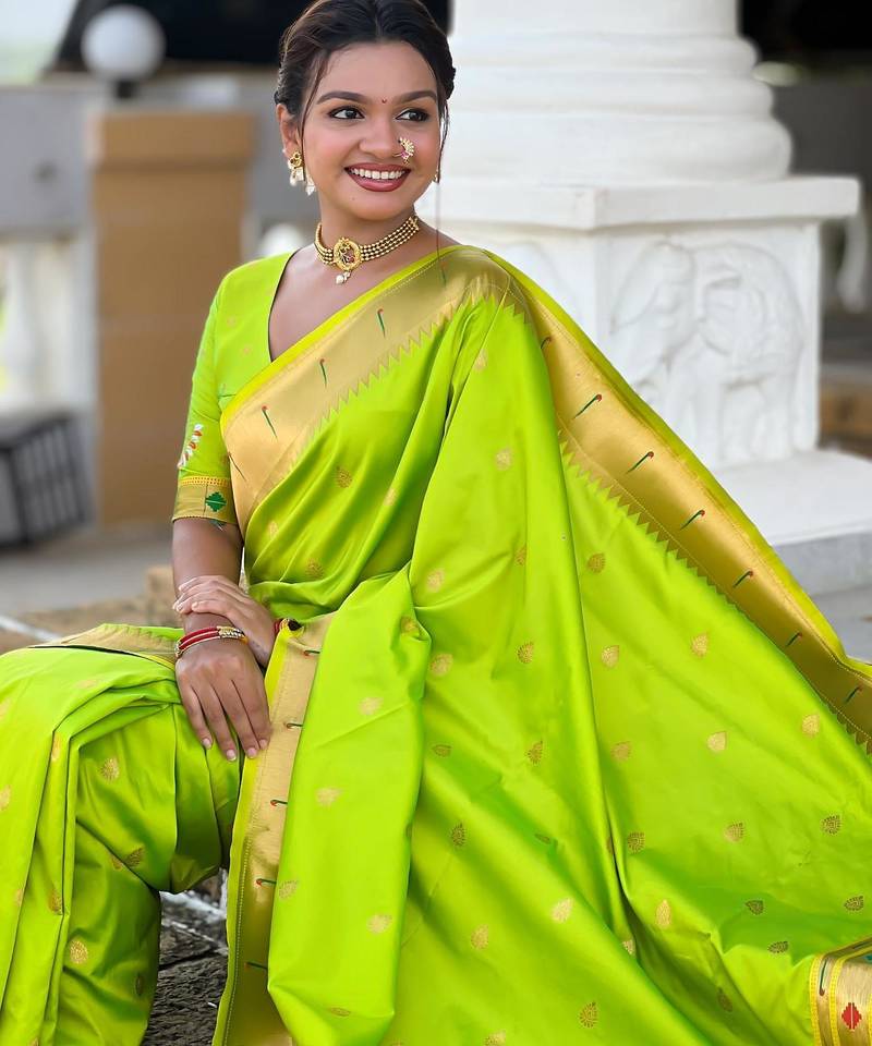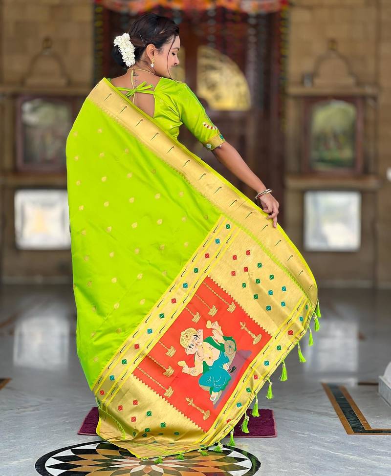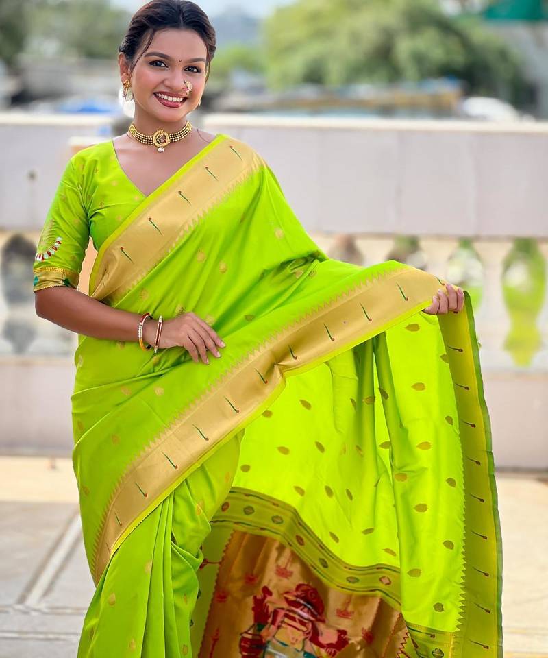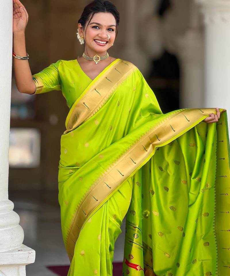 | Product Description | Soft Paithani Silk Saree With Zari Weawing Motifs Design And Meenakari Weawing Rich Pallu With Meenakari Weawing Munia Border & Tassels Attached At Pallu End. Blouse : Enrich Silk Weawing Contrast Blouse Piece With Sleeve Border , |
